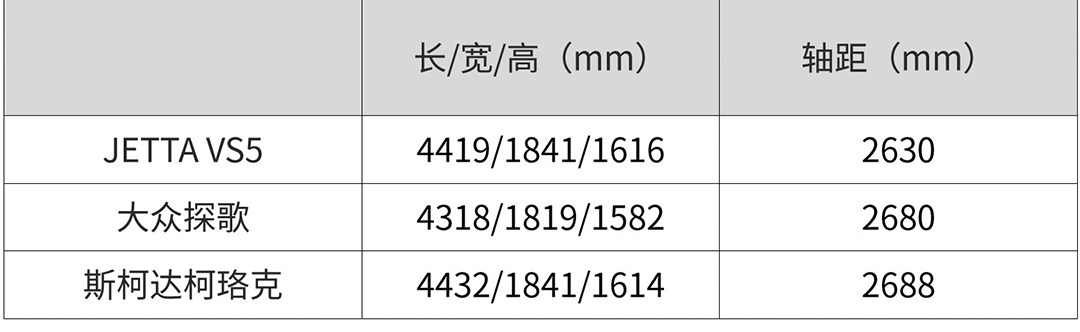 JETTA VS5、大众探歌、斯柯达柯珞克都是基于MQB平台打造的紧凑型SUV,三款车在尺寸方面差距并不大,轴距都在2米6到2米7之间,属于主流水平,在同级中算不上突出的表现,但都能提供相对宽裕的后排空间表现。