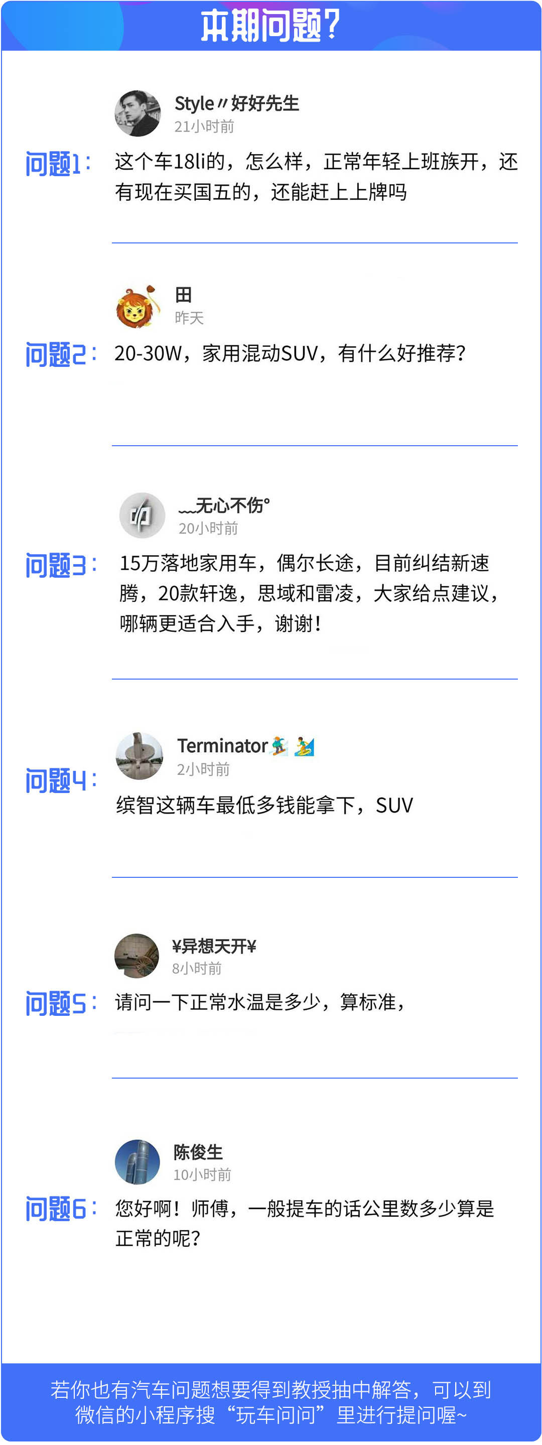 在网友问答栏目中教授将会在小程序-玩车问问里挑选6个问题进行回复,如果对购车、用车有什么疑问的话,欢迎点击下方玩车问问小程序,有许许多多非常厉害的技师为你解答喔!