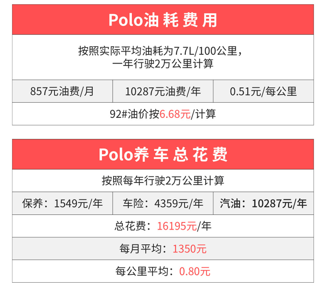 由于新款Polo近期刚刚上市,数据并不齐全,所以我们采用旧款车型进行对比。虽然作为一款代步车,但7.7L的百公里油耗在同级别中并不算十分突出。平均每月在养车上的支出为1350元,是三款车型中开销最高的一款。