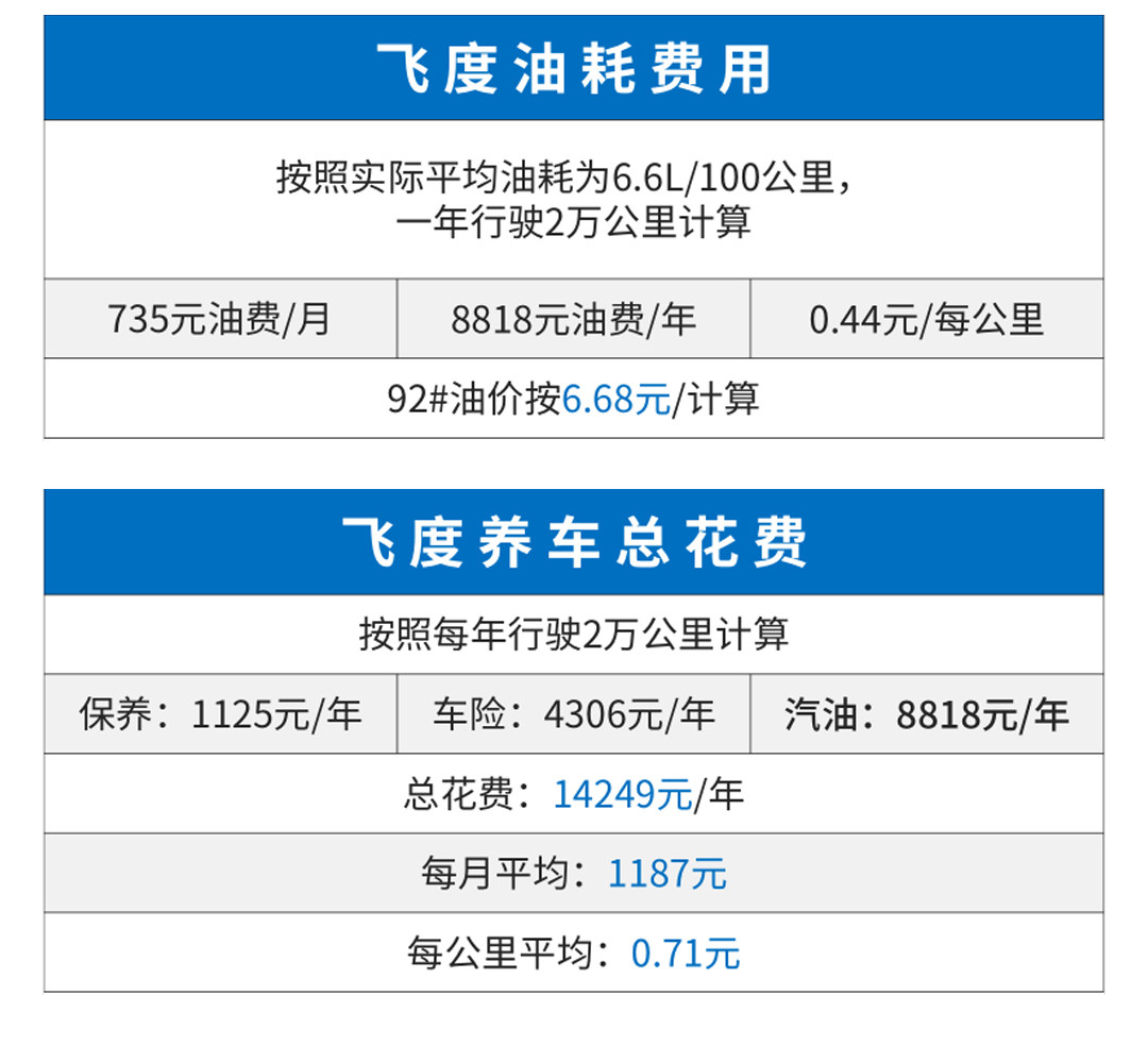 飞度的“节油大师”的称号真的不是白叫的,百公里油耗6.6L,一年行驶2万公里油费仅需8818元,加上保险等杂七杂八的每月养车费用平均下不足1200元,对于收入不高的年轻人而言十分好养。