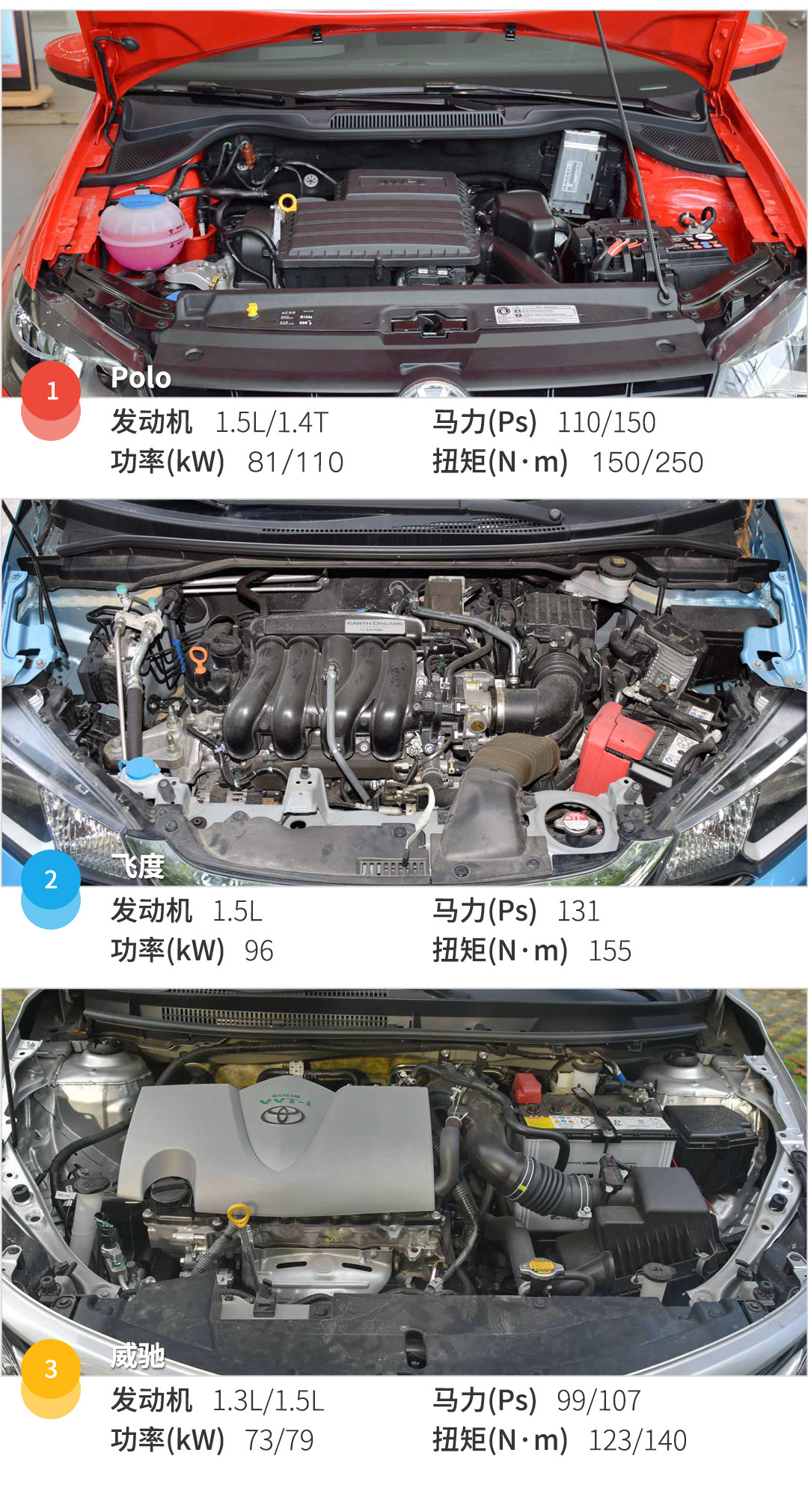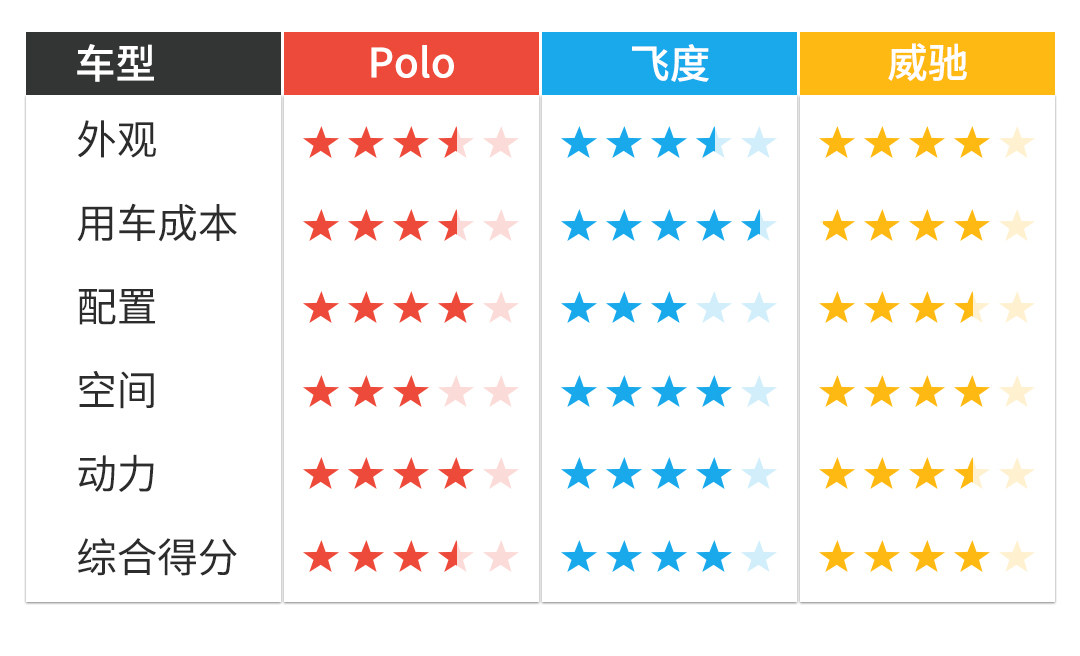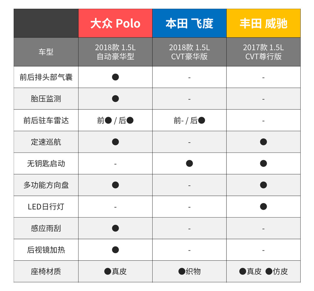 Polo、飞度和威驰均采用顶配版进行比较,可以看出Polo的配置水准要比后两者更高,而威驰涵盖了LED日行灯、多功能方向盘等更多的舒适性配置,飞度的配置全面性则相对较低。