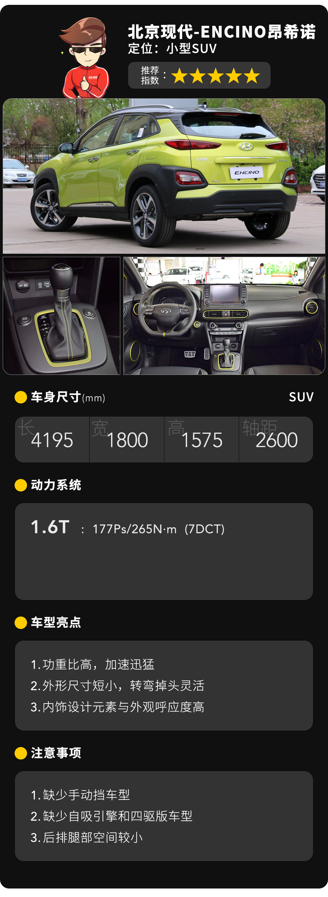 177马力的1.6T引擎放在仅有1.3吨重的昂希诺身上,动力和加速的迅猛感可想而知。只不过这样一台性能如此强悍的“钢炮”,却没有手动挡供选择,算是一件比较遗憾的事情。此外,昂希诺由于外观尺寸较小,大家就不要对它的后排空间有过高期望了,前排坐着自己加上好友或是心上人,两个人一起去嗨就够了不是么?