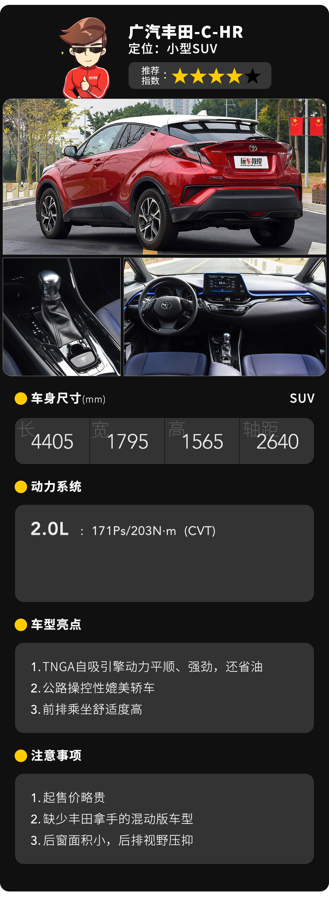 C-HR是丰田近年来设计风格从中庸到激进改变的代表车型之一,整体看着就显得很敦厚,就像一辆小坦克一样。不过,C-HR的最大卖点还是在于机械素质和驾驶乐趣,其2.0自吸引擎属于丰田TNGA系列,热效率高达40%,171马力的数字在同排量自吸引擎中可谓很高,更关键的是还保证了良好的燃油经济性,并能加注92号汽油,最大限度为车主压缩了日常使用开支。