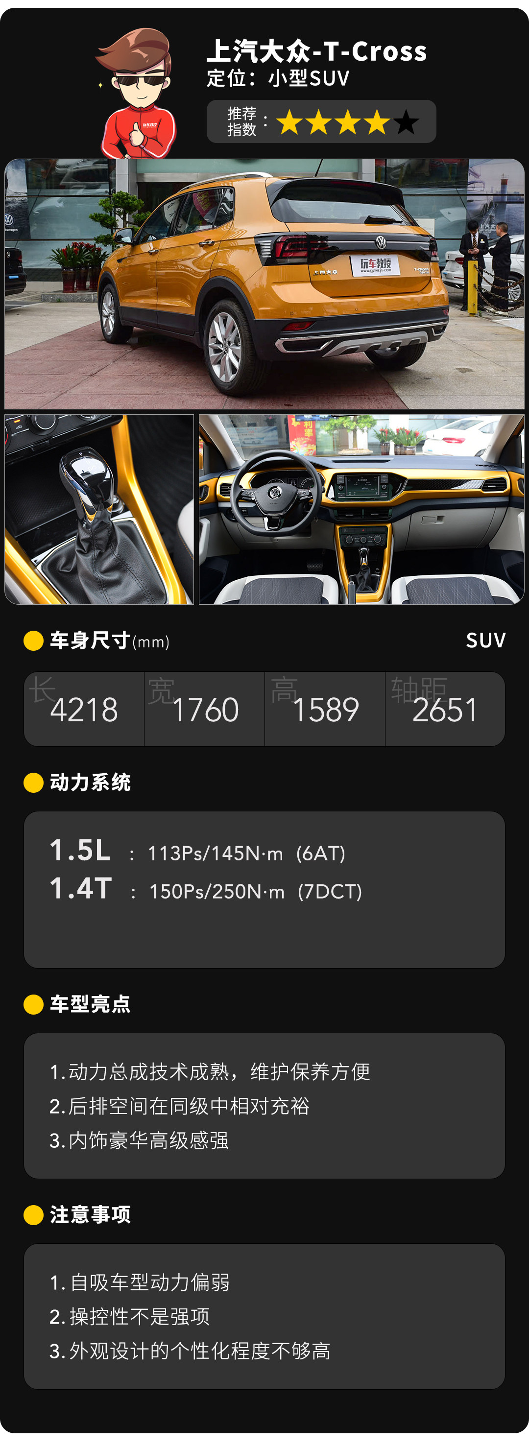 T-Cross是一款既保守又激进的车,其保守在于相比同级其它小型SUV,T-Cross外观设计的辨识度显得不会很高,内饰也一看便知道是一台大众车,动力总成更是十分佛系,与朗逸、宝来这样的三厢家用车完全一致,好处是维修保养十分方便,用车成本不高,坏处则是开起来推背感不强,相对缺乏年轻人喜欢的激情。
