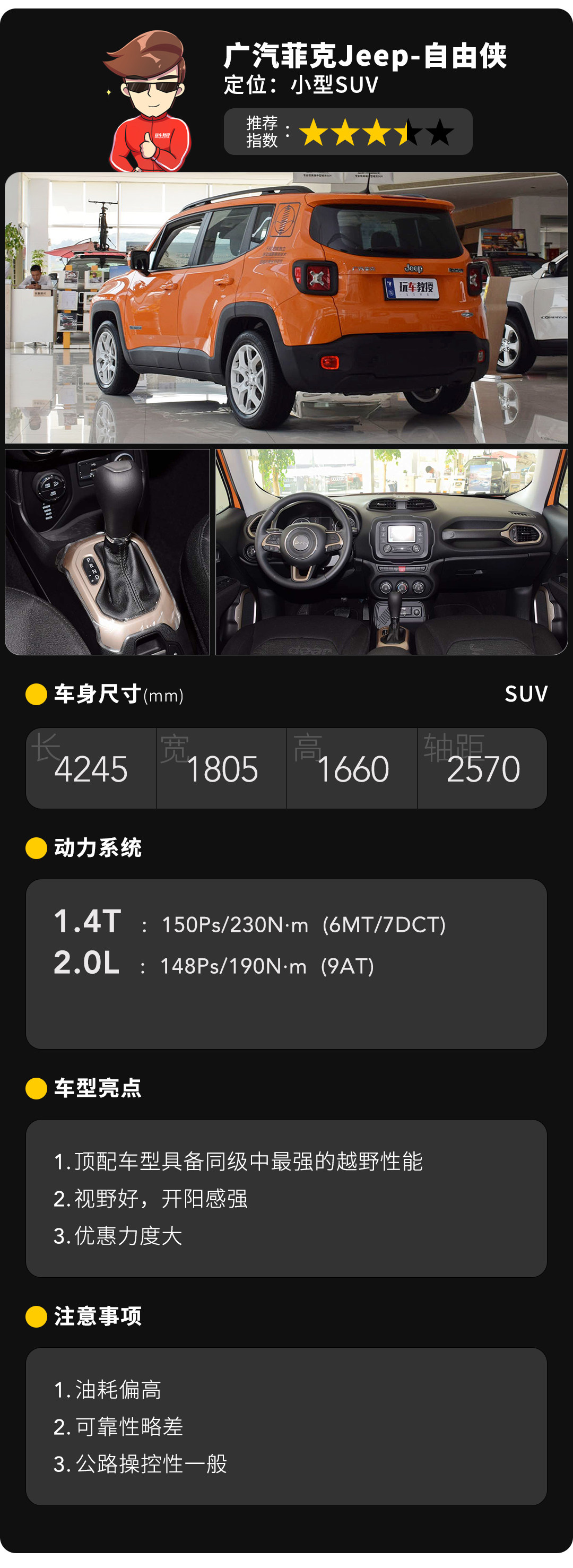 然而,以上这两样配置仅限于顶配,多数人购买的还是中低配的两驱车型,加上自由侠的油耗表现不算太好,可靠性和操控性表现都不突出,因此购买它的人看中的还是Jeep品牌的附加值和自由侠可爱的外观设计,总之就是感性因素大于理性。