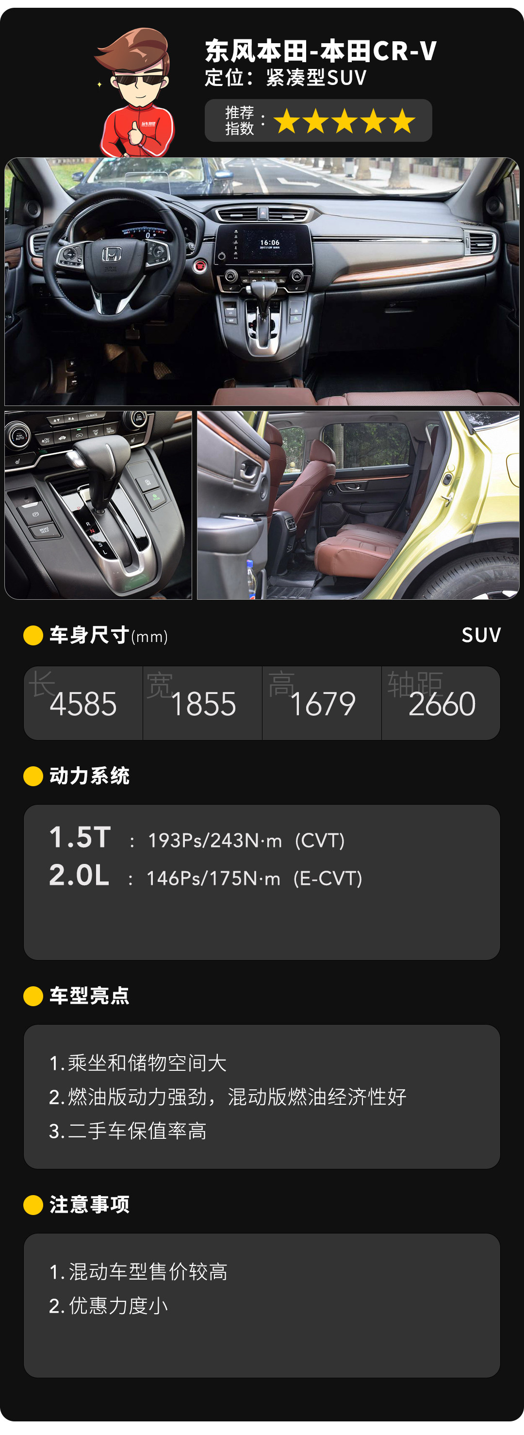 CR-V无论是燃油版还是混动版,动力水平和燃油经济性都兼顾得很好,混动版车型的油耗数字更是很低,对车连续航的提升显著,能尽可能减少你光顾加油站的次数,节约用车成本,可以说,在全新一代丰田RAV4混动版上市前,混动版CR-V在国内都暂无对手。至于缺点嘛,教授能想到的或许就只有混动版CR-V售价略贵这一个了。