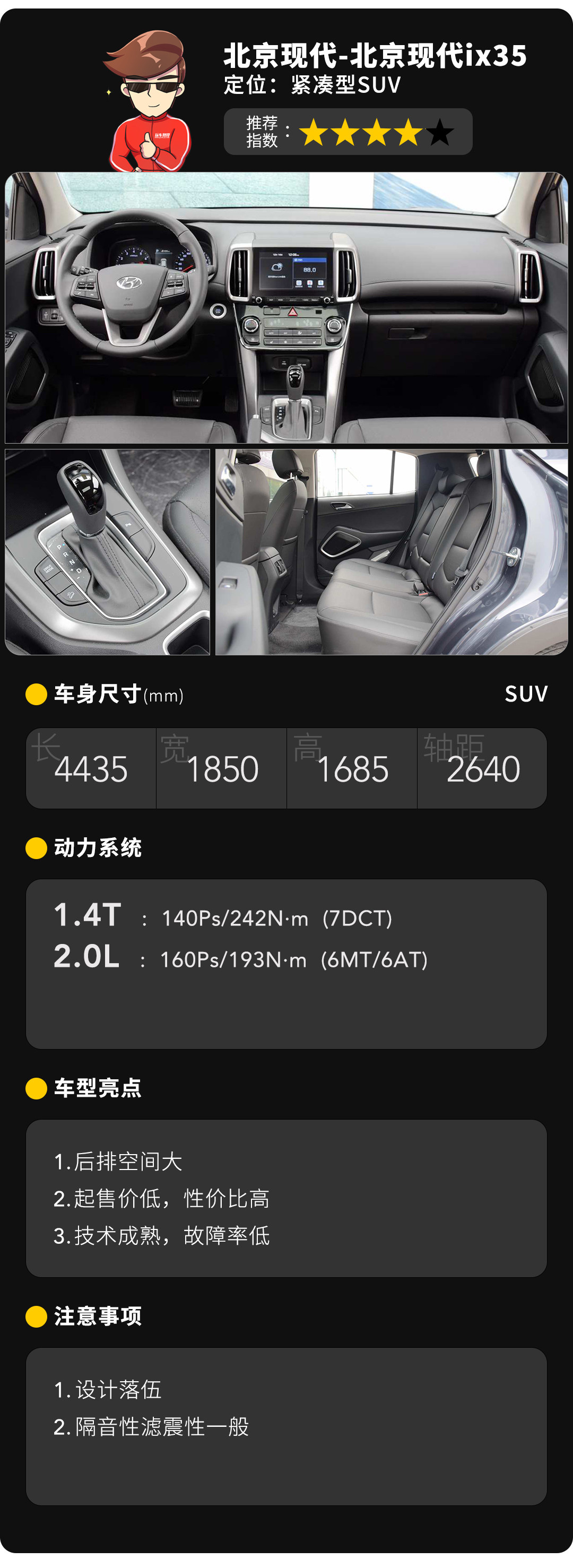 但俗话说有得必有舍,ix35这么低的价位,除了大空间以外,别的方面产品力表现就相对一般了,外观内饰设计和当今主流水准相比都已经落伍了,车型隔音性和底盘滤震性也只是及格的水准,动力总成也是注重成熟可靠性和保养便利性为主,总之就是没啥突出的优点,但也不会有硬伤,卖这个价位,你还想要啥高级的东西?