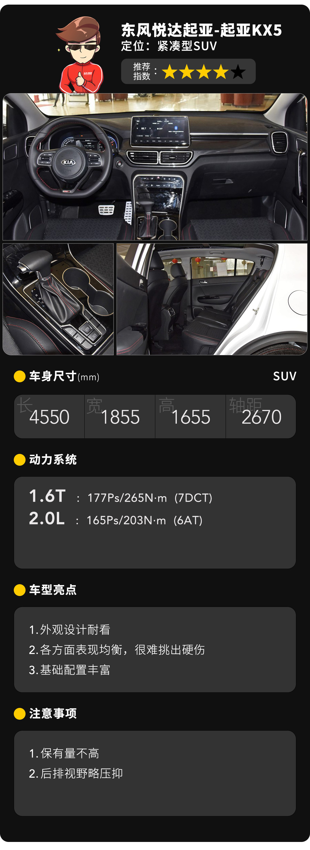 如果你对一台车的颜值有较高需求,想各方面的表现都均衡一点,并希望配置高一些,就看看起亚的KX5。这款车外观内饰设计足够前卫时尚,空间在同级属于中上游水平,并提供了现代起亚集团最新的1.6T+7DCT这套动力总成供选择,动力性和油耗表现都不错,在配置方面也是高于同级别的主流水平。