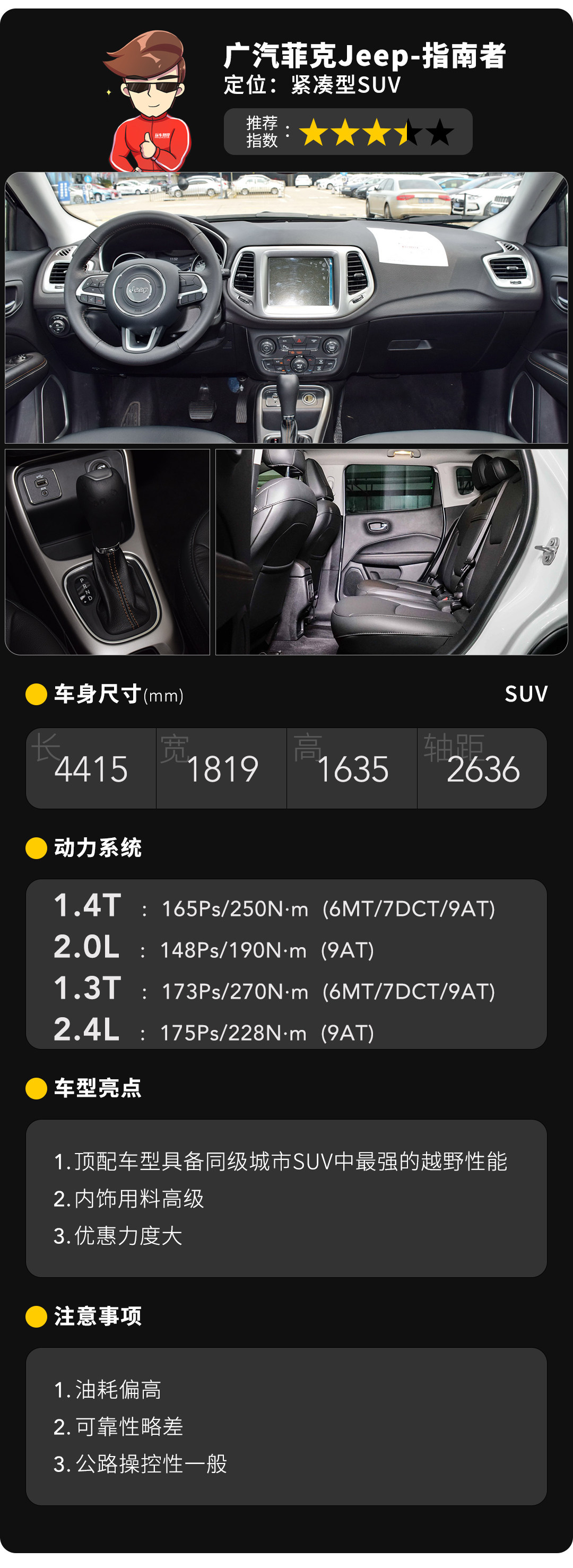 指南者纵使优点非常突出,但是不足也同样比较明显,主要就是四驱版车型由于要照顾非铺装路面性能,四驱系统被调校得介入比较频繁,简单说就是适时四驱系统经常处在在四驱模式下,这样无形中就增加了油耗。因此,你的所在地要是路况不太好,选指南者就比较合适,反之,就还不如看看前面三款车。