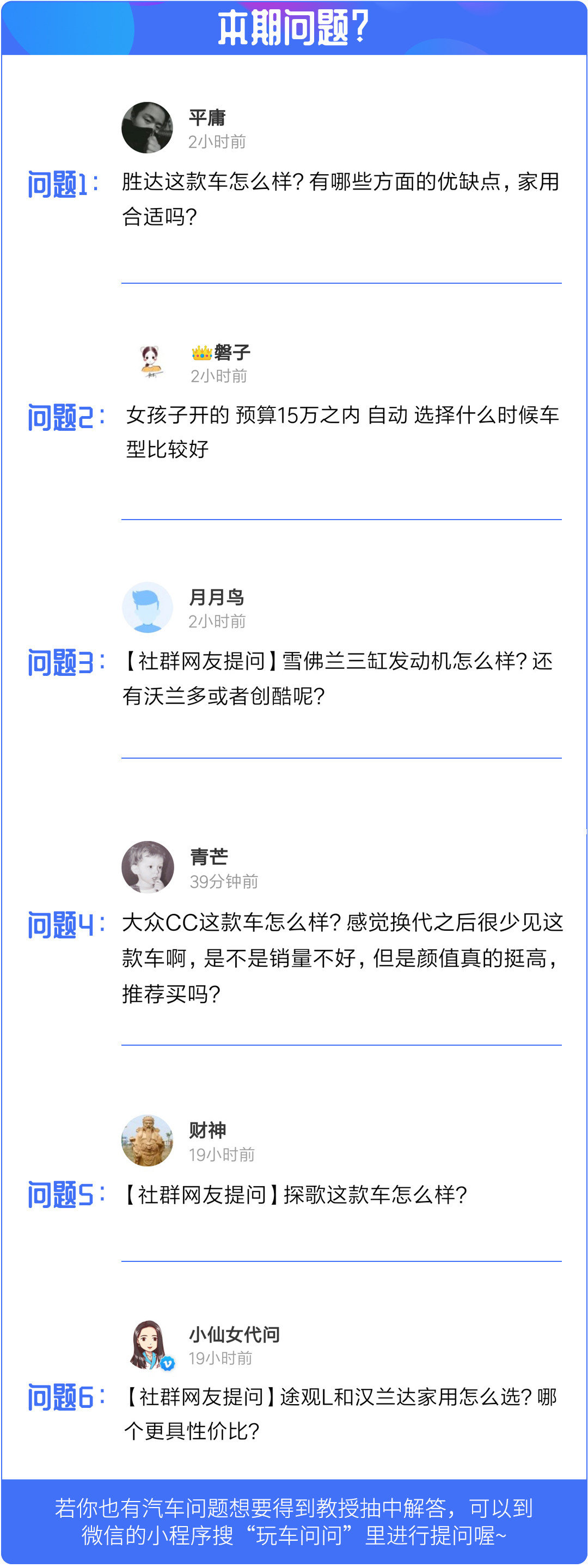 在网友问答栏目中教授将会在小程序-玩车问问里挑选6个问题进行回复,如果对购车、用车有什么疑问的话,欢迎点击下方玩车问问小程序,有许许多多非常厉害的技师为你解答喔!
