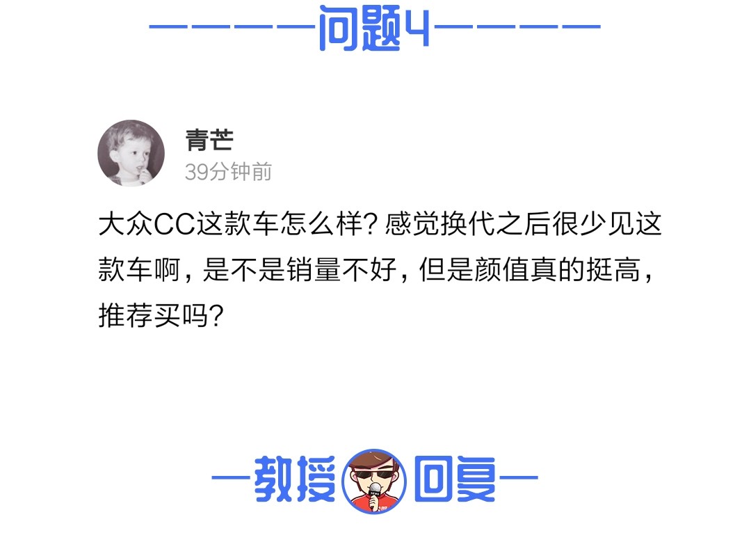 CC这款车换代后销量表现确实一般,最大原因是其定价过高造成的。同级别豪华品牌车型售价不断下探,是买CC还是加点钱上BBA,很多人都愿意选择后者。不过聊回车子本身,CC的实力并不弱,超高的颜值,掀背尾门和无边框车门的应用都为颜值加分不少,配置全面性也有保障。不过由于同平台生产的原因,其驾驶质感和帕萨特以及迈腾有较高相似度。这款车值不值得买,就看你愿不愿意为它的颜值多花一点钱吧。