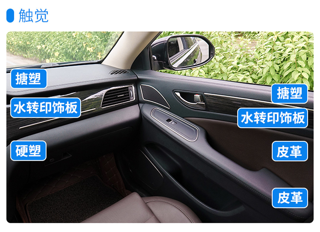 红旗H7的车门内饰板被大面积触感非常高级的皮革包裹。