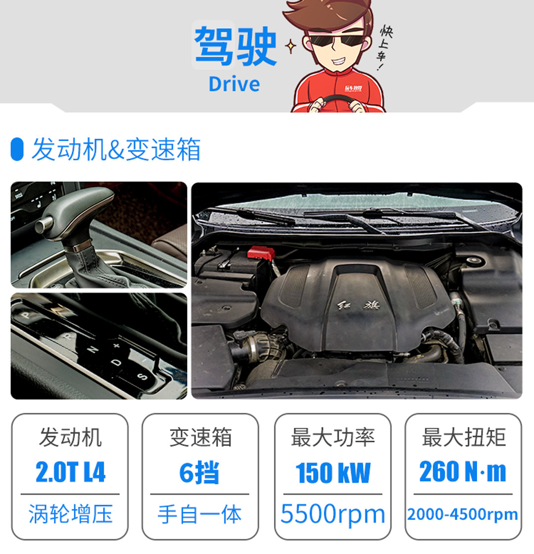 红旗H7搭载自主研发的型号为CA4GC20T的发动机经历过市场的考验,这是一款活塞行程略长于缸径并且压缩比达到10.3的铸铁缸体发动机,搭配同样饱经市场考验的6挡手自一体变速箱,能带来沉稳、浑厚的动力输出。