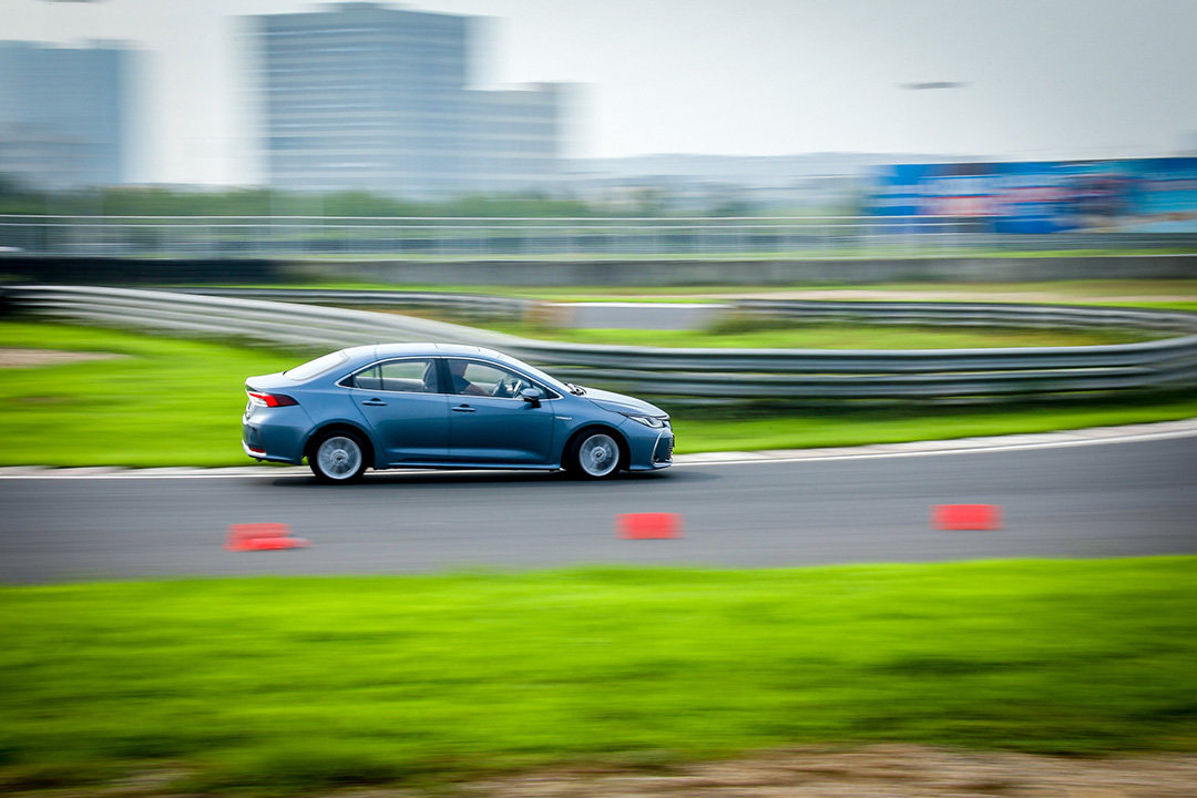 由于只是赛道试驾,时间也比较短,那么教授就把最直观的感受告诉大家吧。首先卡罗拉的油门调教更加灵敏了,整个速度的衔接比老款要好。双擎版在起步阶段只用电机提供动力,动力响应要比燃油版快,而且提速阶段发动机介入的时间比较慢,所以加速感更加显著。