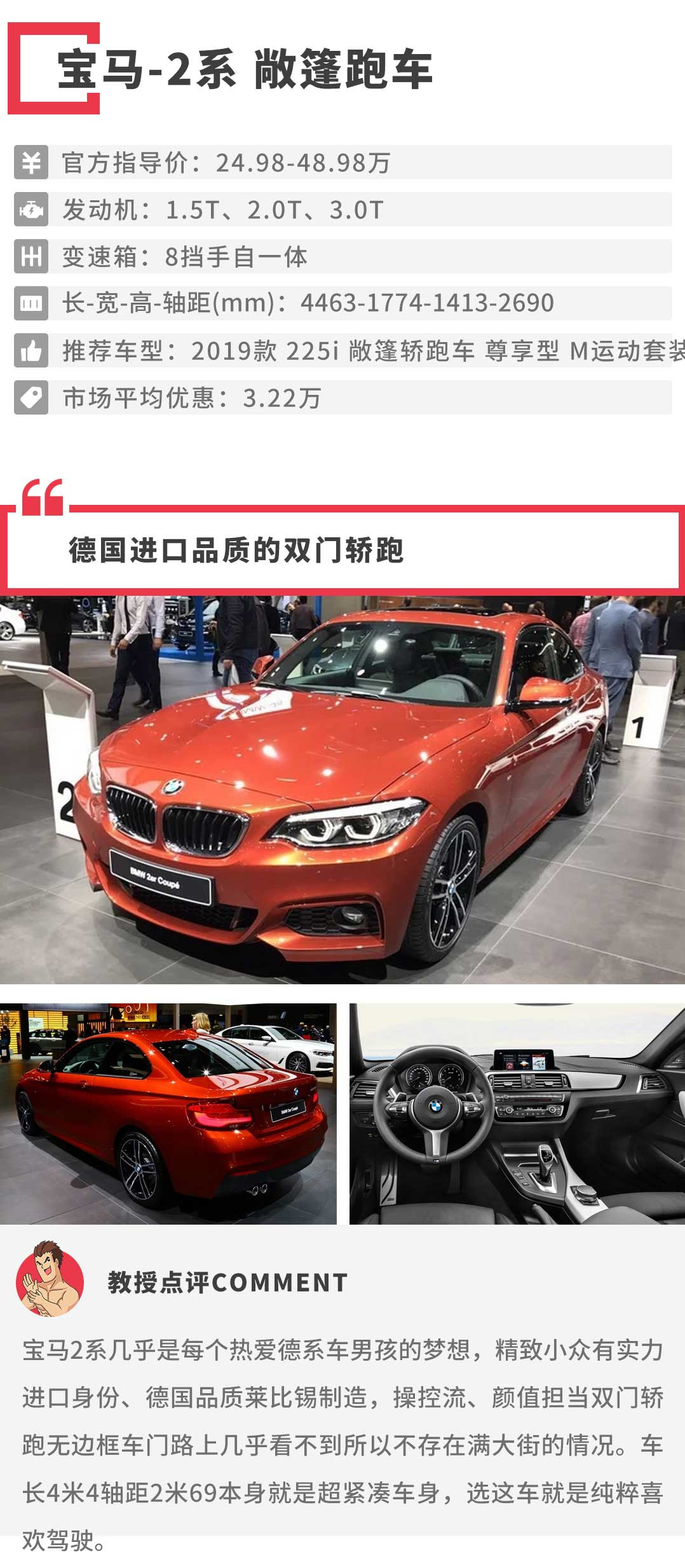 宝马2系单是听名字就能明显感受到它有着很强的实用性,较为奇特的车身造型设计确实让它的车内有着超越同级一般的空间,而且宝马在操控性方面一直都有着较大的名声,可以说这款宝马2系在操控性和实用性上,都完全要超越同级别车型。