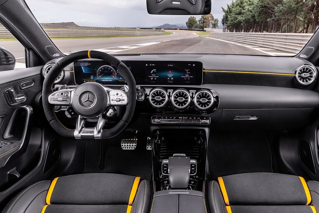在传动系统上,会由现款的7速DCT升级为8速DCT(注意,这个不是双离合,而是把液力变矩器换成两组多片式离合的AT!传动效率更高更直接。),搭配奔驰的4Matic四驱系统,可以让普通版本的A 45只需要不到4秒的时间就完成零百加速,而且A45 S还会更快。在这里,请允许我再说一句,AMG真是个疯子。