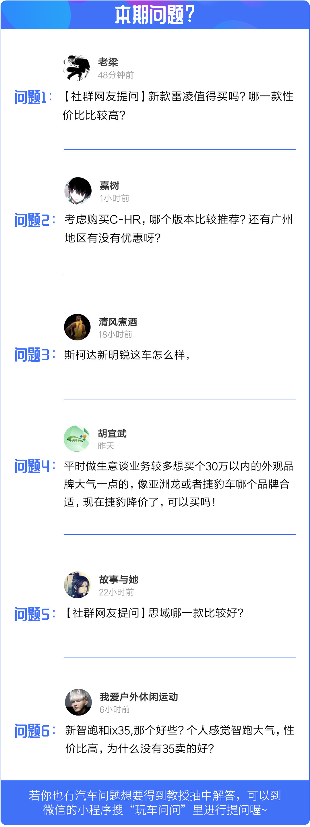 在网友问答栏目中教授将会在小程序-玩车问问里挑选6个问题进行回复,如果对购车、用车有什么疑问的话,欢迎点击下方玩车问问小程序,有许许多多非常厉害的技师为你解答喔!