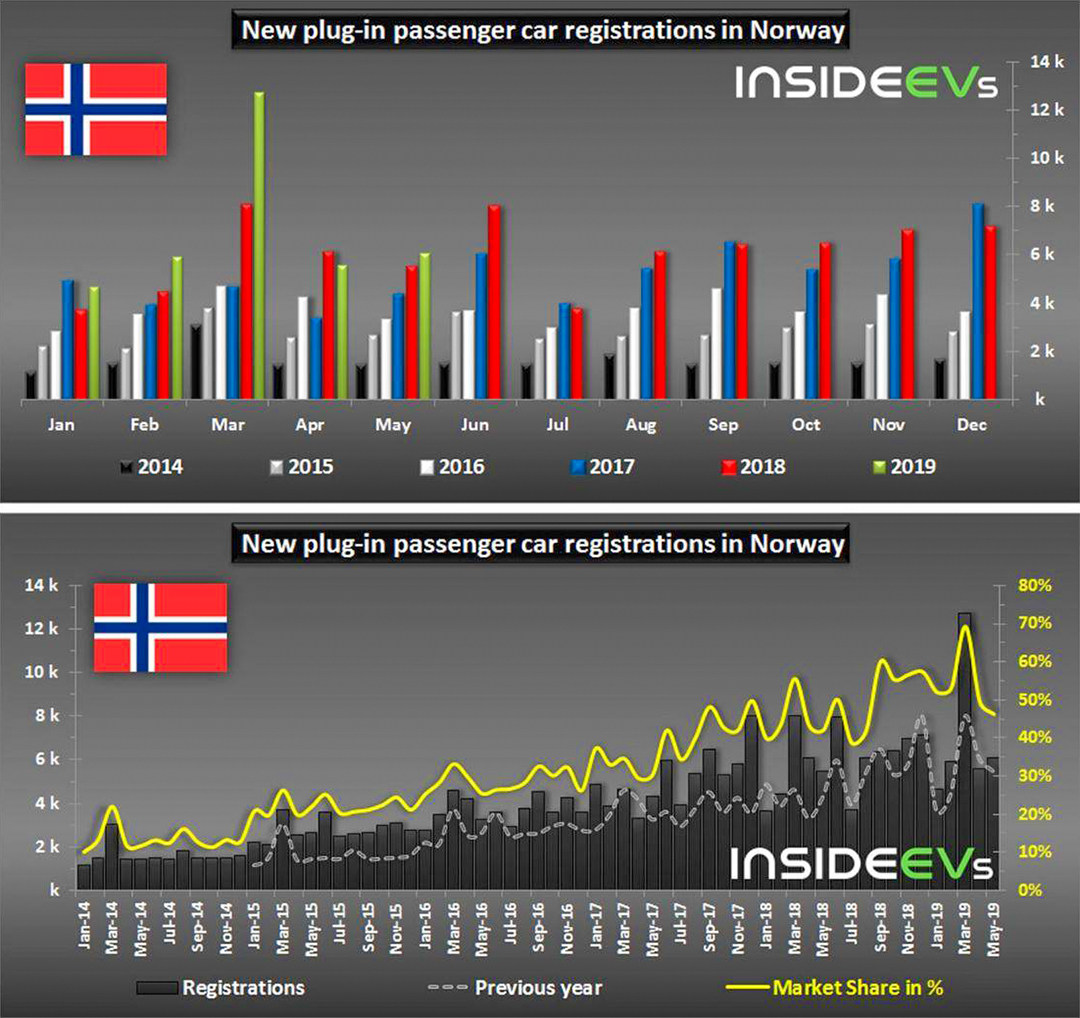 (挪威2014年-2019年五月 新能源汽车增幅图表)