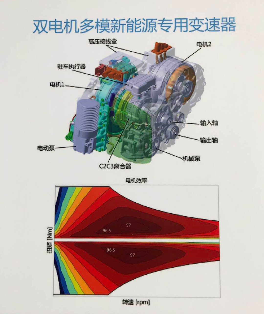而混动专用变速箱方面,官方介绍这套双电机多模变速箱内含三个动力源,能分别在两个不同挡位上驱动,一方面换挡过程无动力中断,另一方面能形成10个组合挡位,支持纯电驱动、增程模式驱动、并联模式驱动、发动机直驱等9种工作模式,适用于纯电、弱混、增程、插混等多种环保车型,变速箱最大输入扭矩510N·m,足以解决市面大部分新能源车需求。