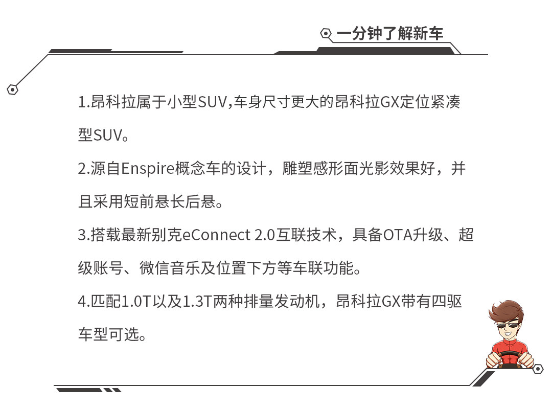 近日,上汽通用别克就发布了两款专门为年轻人打造的SUV——昂科拉以及昂科拉GX。昂科拉售价为12.59万元-15.59万元,昂科拉GX售价为15.59万元-18.59万元,它们真的“不负年轻”吗?我们不妨一起看看。