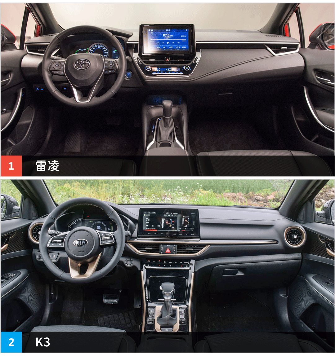 乍一看,雷凌和K3两款车在内饰的豪华氛围感营造上都做得相当好,但细看则还是能够发现取向上的差异。例如,雷凌主要通过触控+少量实体按键式中控台、悬浮式中控屏等配置的造型设计来营造一种简约豪华感,而K3则主要通过更大尺寸的液晶仪表和中控屏、还有更多舒适性配置的堆砌来营造一种居家豪华感。这种差异和它俩各自的外观设计一样,体现了目标用户的差异化,雷凌更讨年轻人欢心,K3在主要瞄准顾家熟男市场。