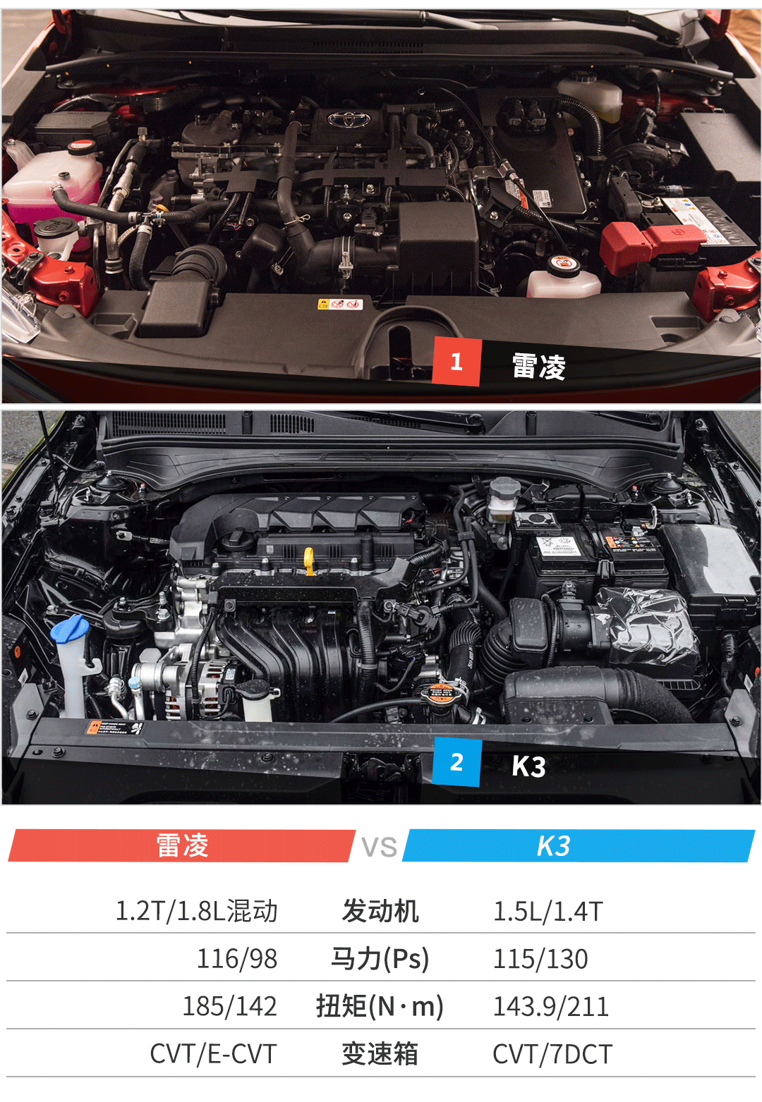 全新一代雷凌放弃了老款的自吸引擎,仅提供1.2T涡轮增压发动机和1.8混动车型,并且混动版车型的具体分为5个配置,和燃油版一样多,这表明丰田已经把混合动力视为未来的主力发展方向,相信取代燃油版成为销量大头也是迟早的事。全新一代K3主推采用了1.5自吸+CVT的车型,这套动力总成虽然在动力参数和燃油经济性上都比老款有很大提升,但除了养护费用较低外,其他方面的性能表现依旧还是不如老对手雷凌的两套动力总成,看来雷凌这位“师傅”的表现还是更加“老练”一些。