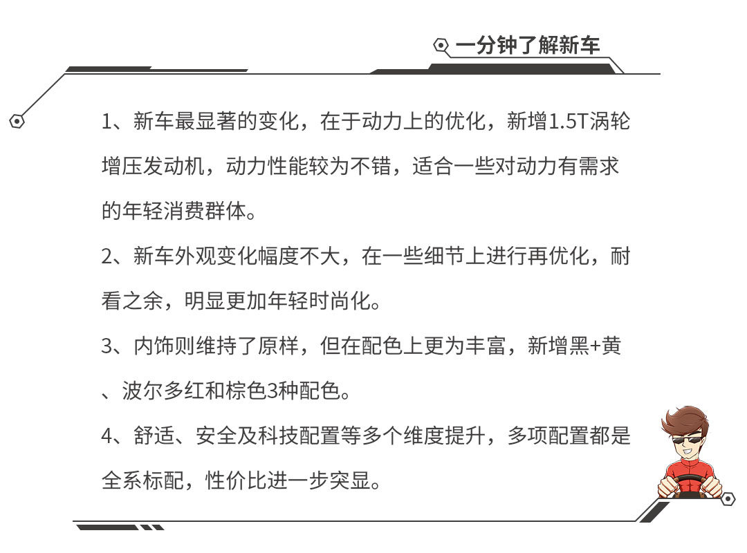 车身尺寸得到优化,相比现款车型而言,车身长度增加了60mm,再结合原先不错的内部乘坐空间,优势更为突出。内饰设计上,维持了原样,但在配色上更为丰富,新增黑+黄、波尔多红和棕色3种配色。