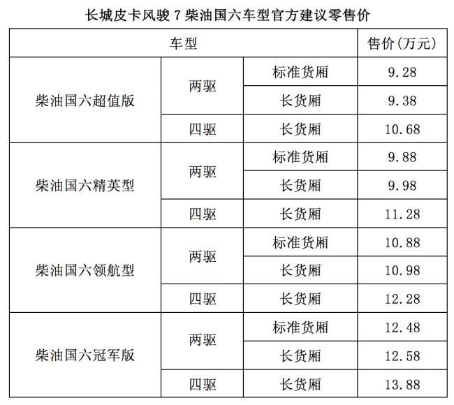 日前,长城皮卡官方宣布,风骏7柴油国六车型正式上市,官方建议零售价9.28万-13.88万元。风骏7本次共推出12款车型,包括超值版、精英型、领航型、冠军版,并有两驱、四驱和标准货厢、长货厢版本可选。风骏7柴油国六车型全系搭载2.0T柴油发动机,满足国六B排放标准。9.28万元的起售价,成为目前市场上10万元以下唯一一款柴油国六皮卡。