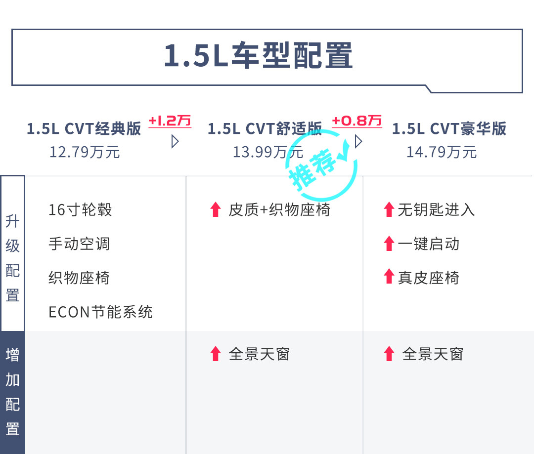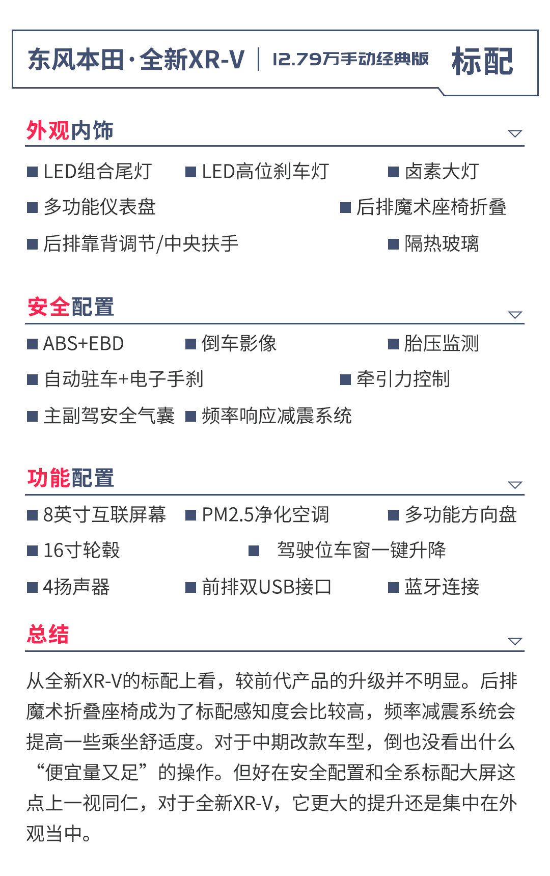 实际上,真要从配置入手,这次中期改款XR-V在选择上还真的不用有太大的期待,全系标配基本足够使用,至于多加一万元带上皮座椅/全景天窗这些的完全就看消费者的选择了,1.5T高配两款车型才有全LED灯组,顶配独享主动安全/定速巡航。东风本田这次很好的灌输了什么是“一分钱一分货”。