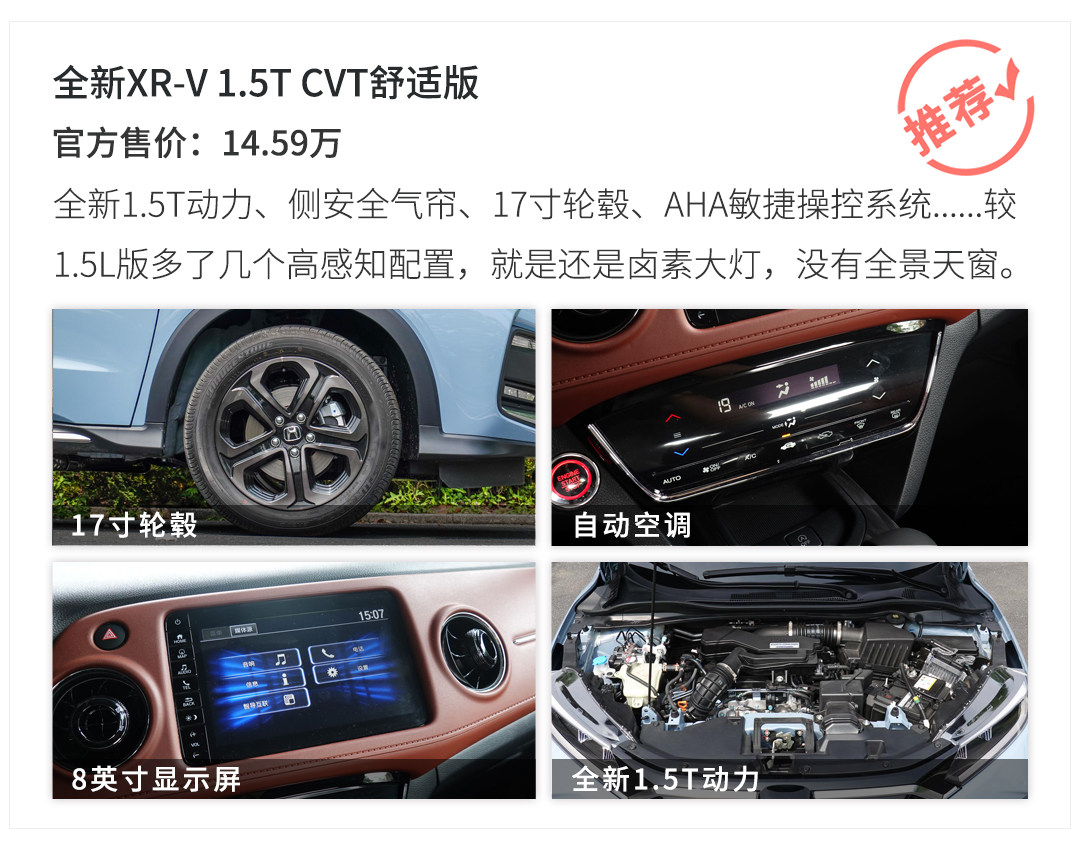 从“够用”的角度出发,全新XR-V1.5L/1.5T买低配完全够用,更高的配置升级的主要是“锦上添花”的观感配置,但教授更建议大家去选择1.5T车型,在本田普及涡轮动力后,这款1.5T成为了产品主力,“220Turbo”的尾标表示其与思域上的那台是相同参数。较老款的1.8L参数上提升了不少,驾驶体验也会有一定不同。如果预算卡的很紧,也可以选择经典的1.5L版本,这次两款发动机同步升级了国六排放标准。
