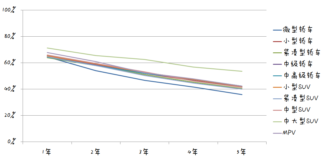 而一年之后,新车的保值率是以阶梯式下滑的,总体而言比较稳定,并未出现断崖式暴跌。