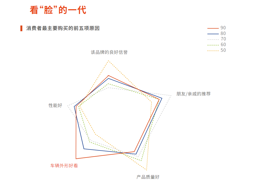 根据J.D. Power的数据,如今90后消费者购车最主要的原因是“车辆外形好看”。相较之下,50后消费者最看重“产品质量好”,70后最看重“朋友/亲戚的推荐”。