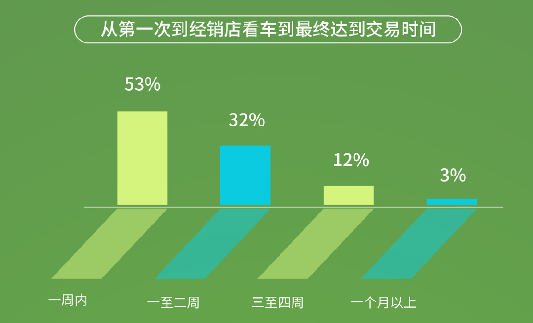 数据还表明,中国车主购车的速度非常快,有超过一半的车主都能在一周之内达成交易,并且,97%的车主都是在一个月之内完成交易的。