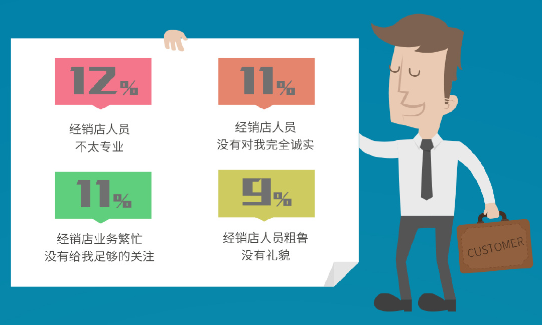 而从调查数据来看,确实有不少人对4S店的印象都比较负面,其中主要表现为经销店人员不够专业、不够实诚、看车被冷落、服务态度差等。