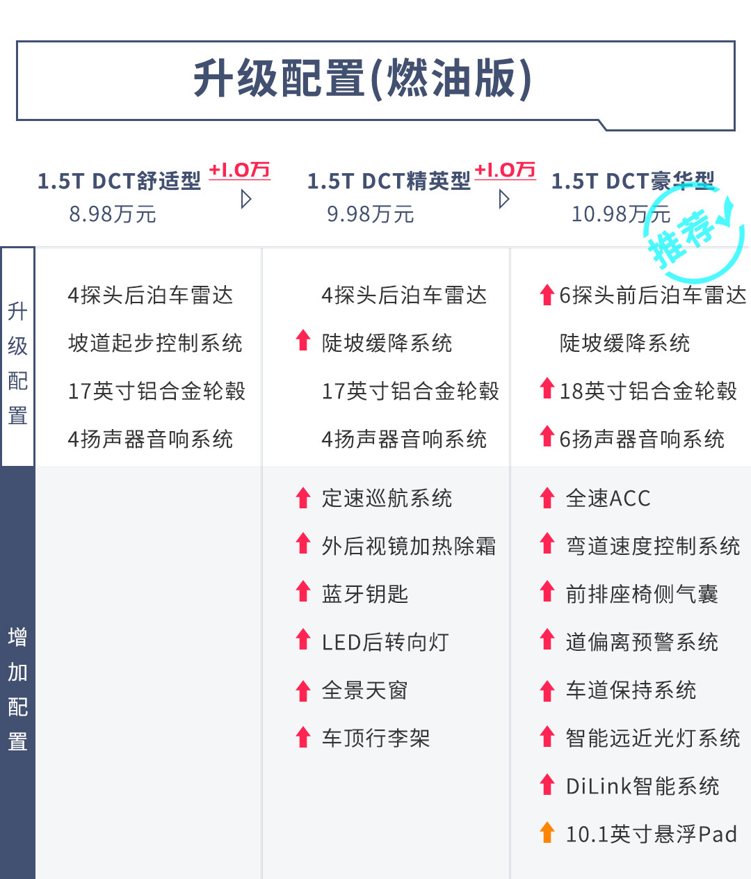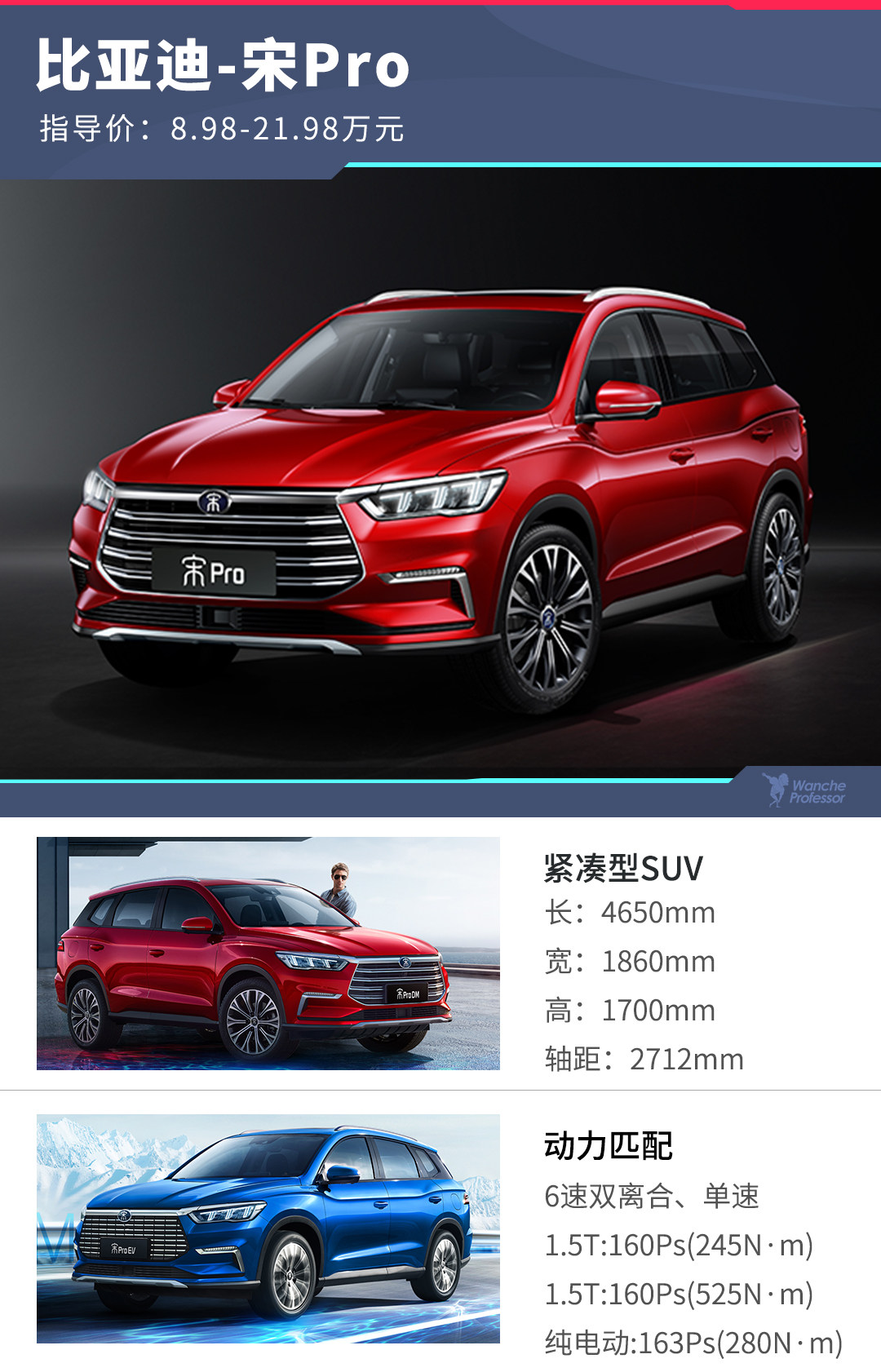 7月11日,比亚迪旗下王朝系列车型——宋Pro正式上市,新车提供燃油版/DM版(插电式混合动力)/EV版(纯电动)三种动力形式,共12款车型。燃油版的售价区间为8.98-11.98万元,拥有4款车型配置可选;DM版在补贴后的售价区间为16.98-21.98万元,总共有4款车型配置可选;至于最后的EV版在补贴后的售价区间为17.98-21.98万元,也是有4款车型配置可选。对于这三种动力形式要怎么选,你肯定比教授更清楚,但如果是问哪个车型配置最划算,那就是教授的长项了!