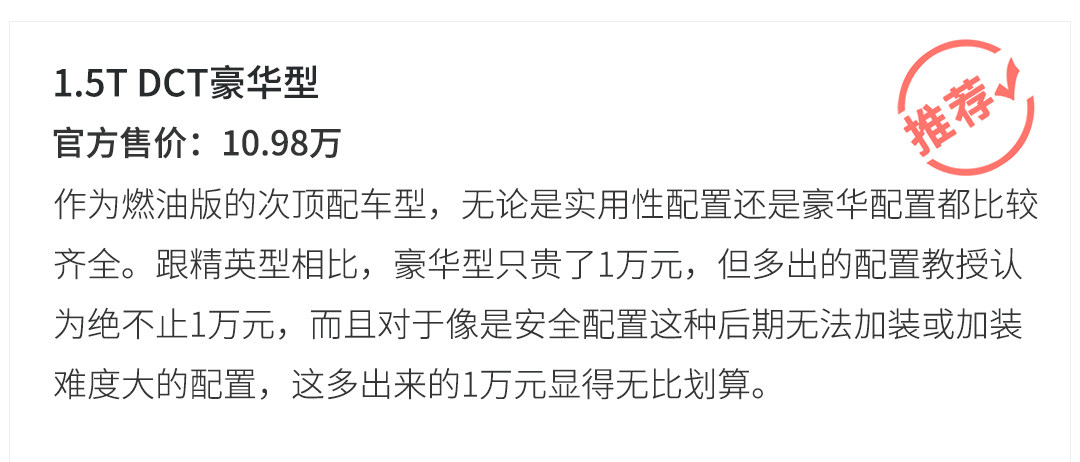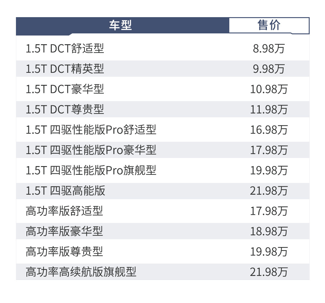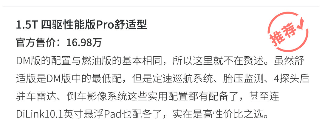 DM版车型的动力总成为1.5T发动机+6速双离合变速箱+电机组来组成的第三代DM双模插电混动系统,所有车型的电池容量均为15.7kWh,并且纯电续航(NEDC工况法)为81km。