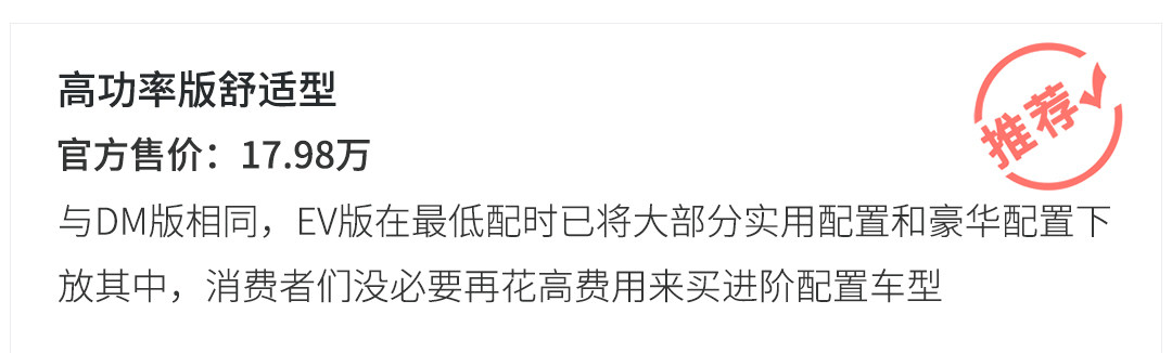 EV版其中三款是标准版(舒适型、豪华型和尊贵型),另外一款则是高续航旗舰版。区别在于标准版纯电续航(NEDC工况法)为405km,高续航旗舰版的纯电续航(NEDC工况法)则为502km。