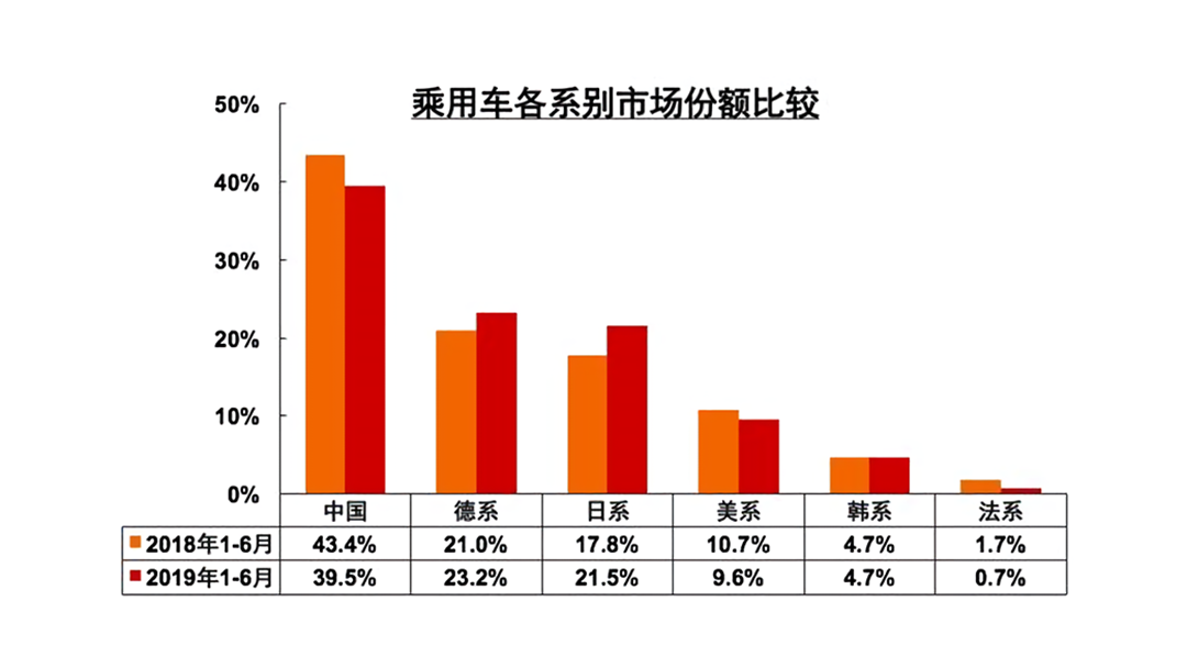 从上图上我们可以得知,相较2018年上半年,中国品牌份额略有下跌,达到了39.5%。德系和日系占据了第二、第三的位置,两者实际市场份相差不远。美系则依然处于中流水准,占比略有下降,另外的韩系以及法系则依然处于边缘。