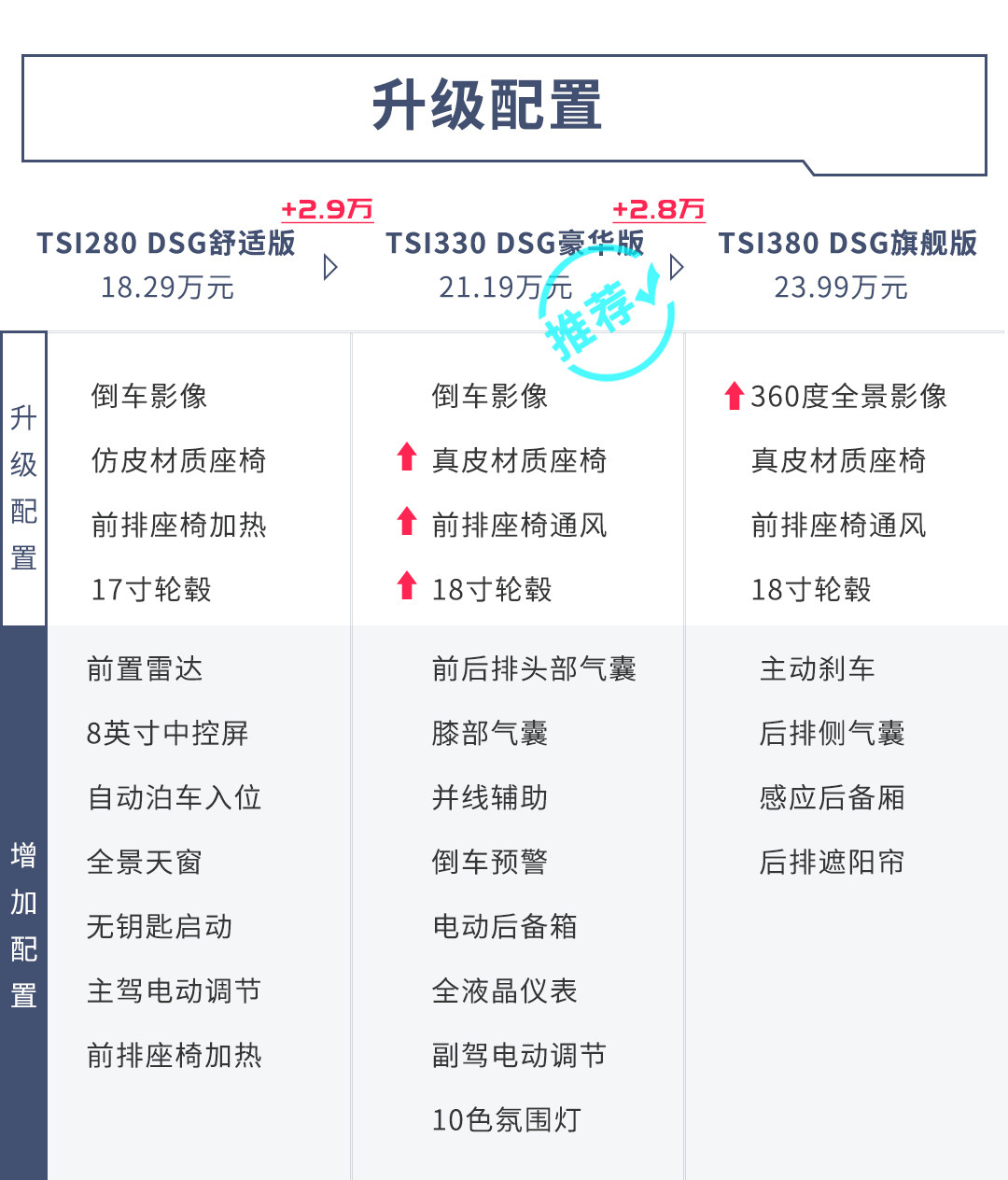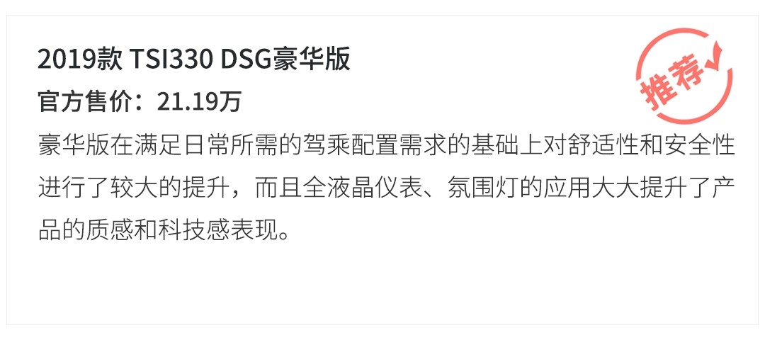 在TSI280 DSG舒适版和 TSI330 DSG豪华版之间还拥有一款TSI330 DSG舒适版。但其与前者相比更多的是动力方面的提升,配置基本上还是维持在同一水准上。虽然豪华版更值得推荐,但两款舒适版的配置已经有着比较全面的水准,而其中2.0T发动机动态表现更好,因此在280舒适版和330舒适版之间个人更推荐后者。