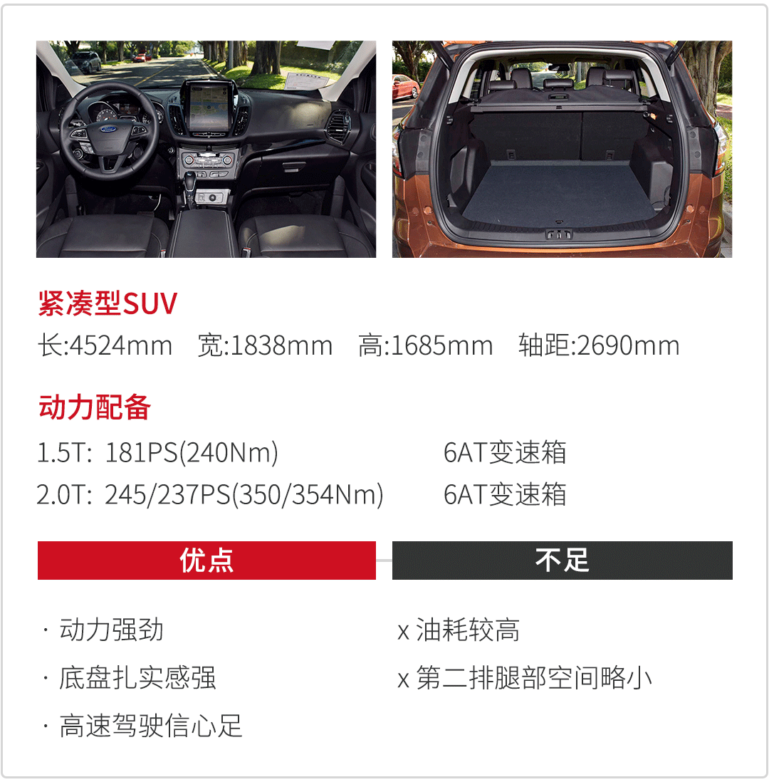 翼虎的卖点则在于拥有同级紧凑型SUV中最强劲的动力,作为主力销售的2.0T车型,国5车型最大马力245匹,而国6车型也有237匹,扭矩则分别为350和354牛米,要知道这套动力原本搭载在整备质量超过2吨的中型SUV锐界身上,下放到车重1.7吨的翼虎身上,加速感受可想而知有多么畅快。