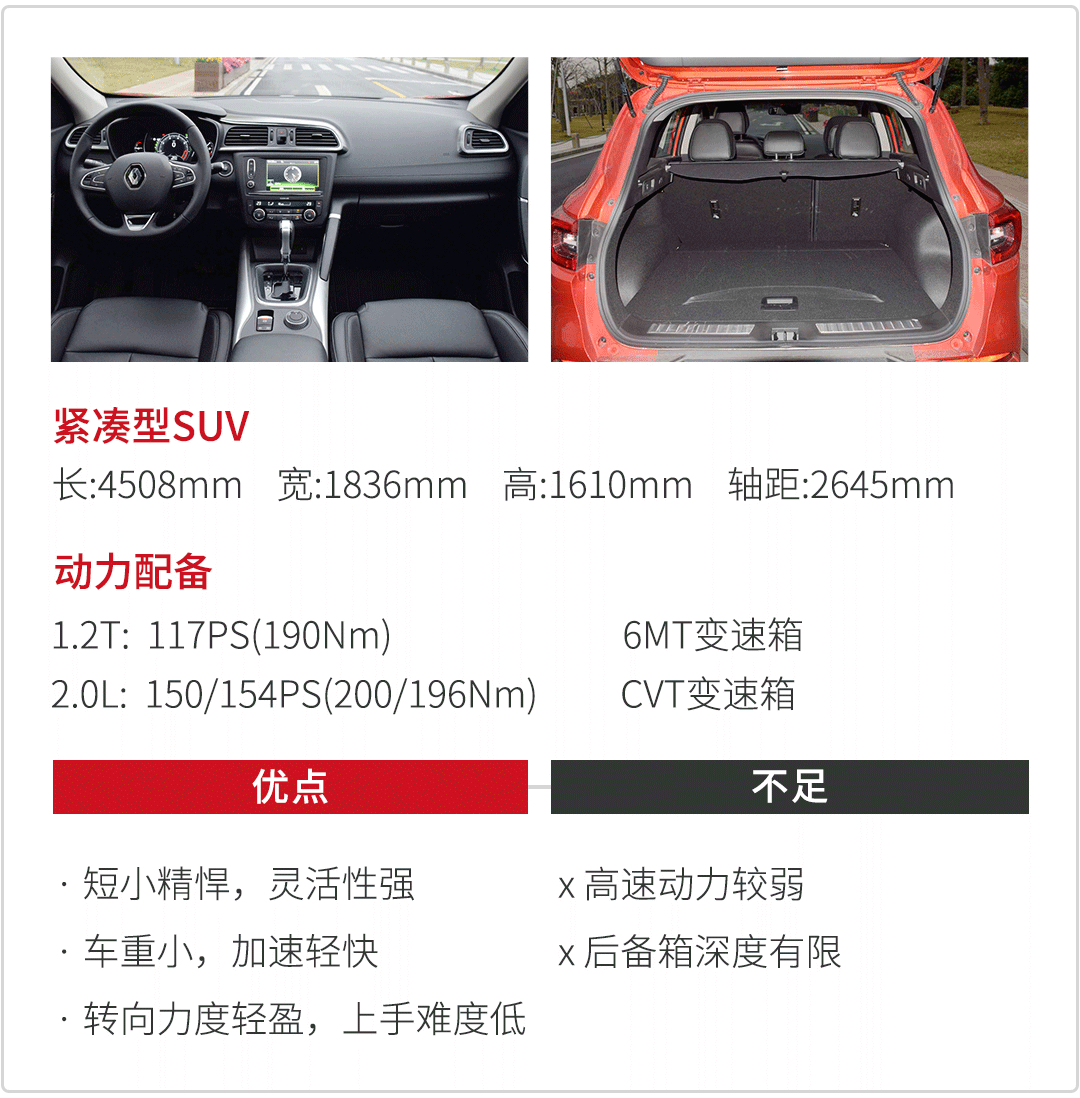 科雷嘉主销的2.0自吸车型仅提供CVT变速箱,其目的也是为了实现省油和轻松的“傻瓜式”驾驶,挂到D挡就能舒舒服服地驾驭它。至于唯一一款搭配手动挡的1.2T车型,则主要为了拉低售价,在此不太推荐。