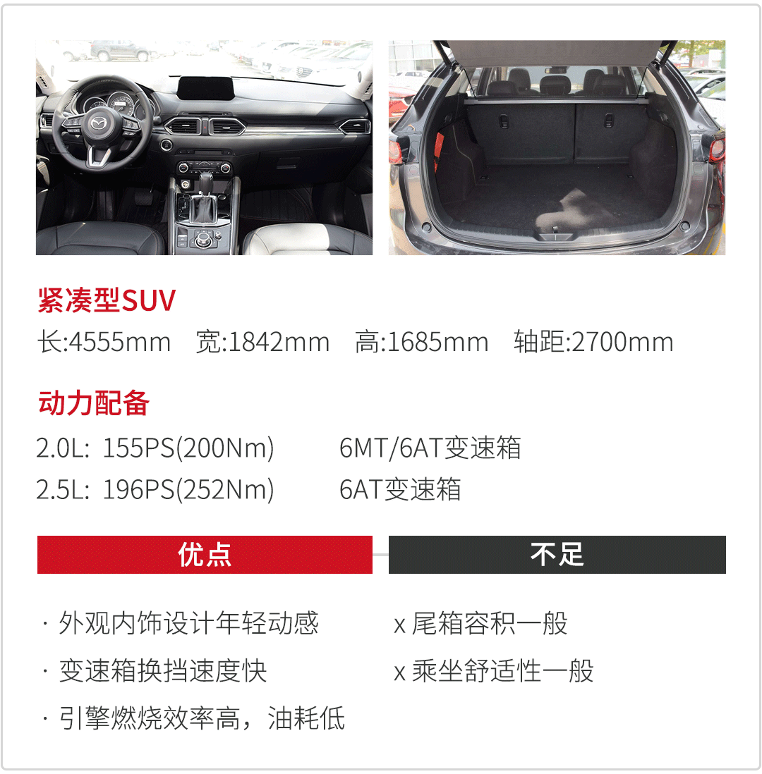 也正因如此,教授推荐大家购买2.5排量的CX-5,这是因为2.0车型纵使引擎本身燃油经济性表现更出色,但用在车重接近1.6吨的CX-5身上,载人载物时难免会出现小马拉大车的高负载工况,经常需要深踩油门,切换为普通的奥托循环以优先保证动力,此时2.0车型的动力性和燃油经济性反而不如排量更大、运转区间更经济的2.5车型。