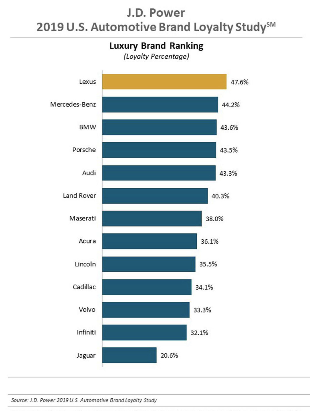 除去普通品牌,J.D.Power也评选出了2019消费者豪华品牌忠诚度榜单。在豪华品牌当中,雷克萨斯车主的忠诚度最高,紧跟随后的是梅赛德斯-奔驰、宝马、保时捷和奥迪。捷豹、英菲尼迪和沃尔沃则排在最后三位。表格详情请见下图: