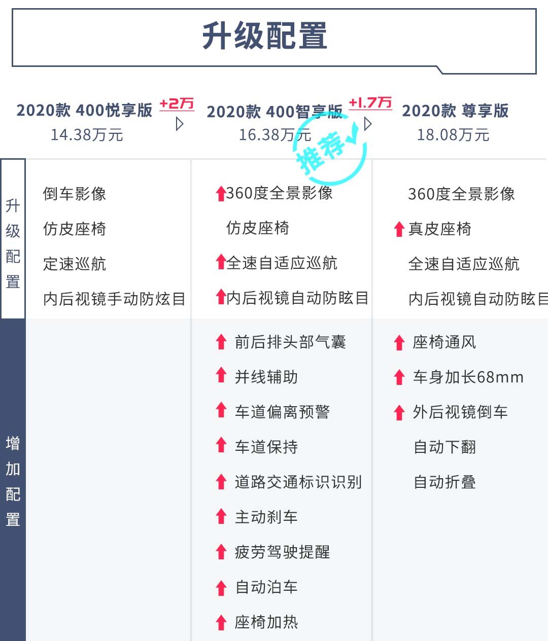 小鹏G3的400km续航和520km续航版分别各有三个配置,悦享版、智享版和尊享版。悦享版的基础配置已经非常高,但是一些自动驾驶方面传感器的缺失会让这台车无法享受迭代带来新功能,这恰恰是小鹏G3最吸引的地方,所以不推荐这个版本。