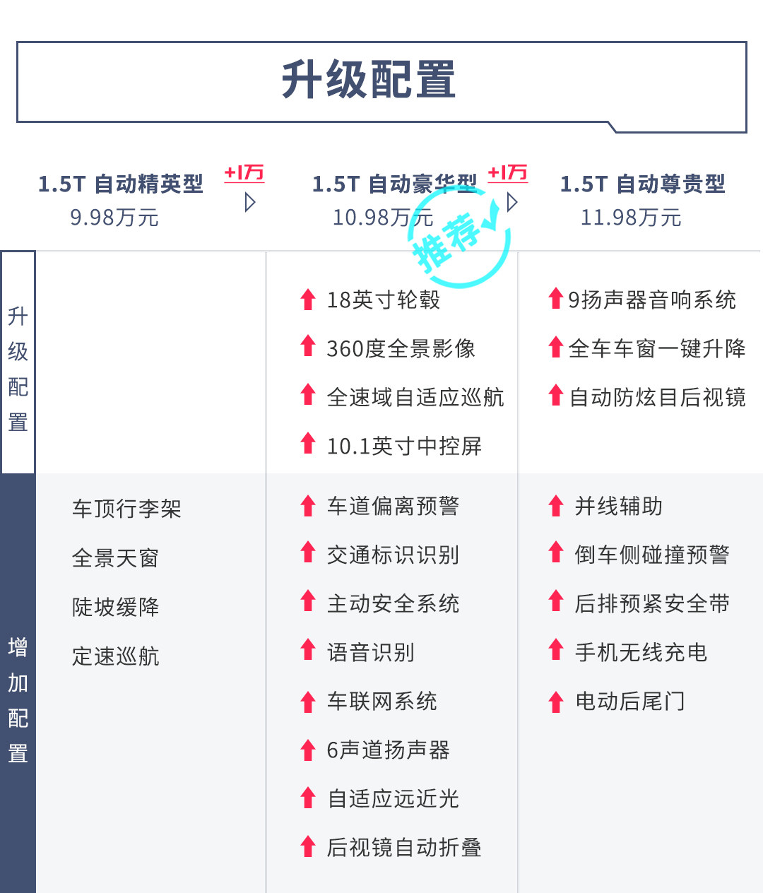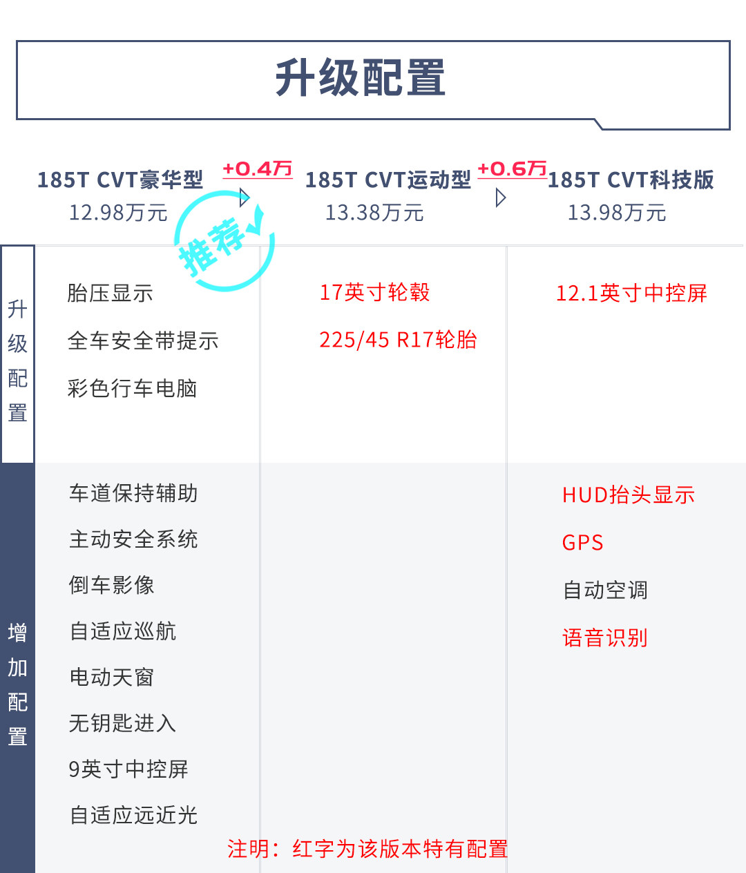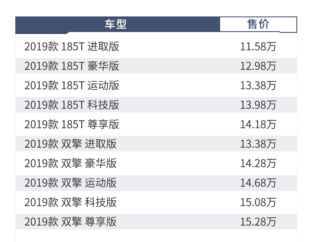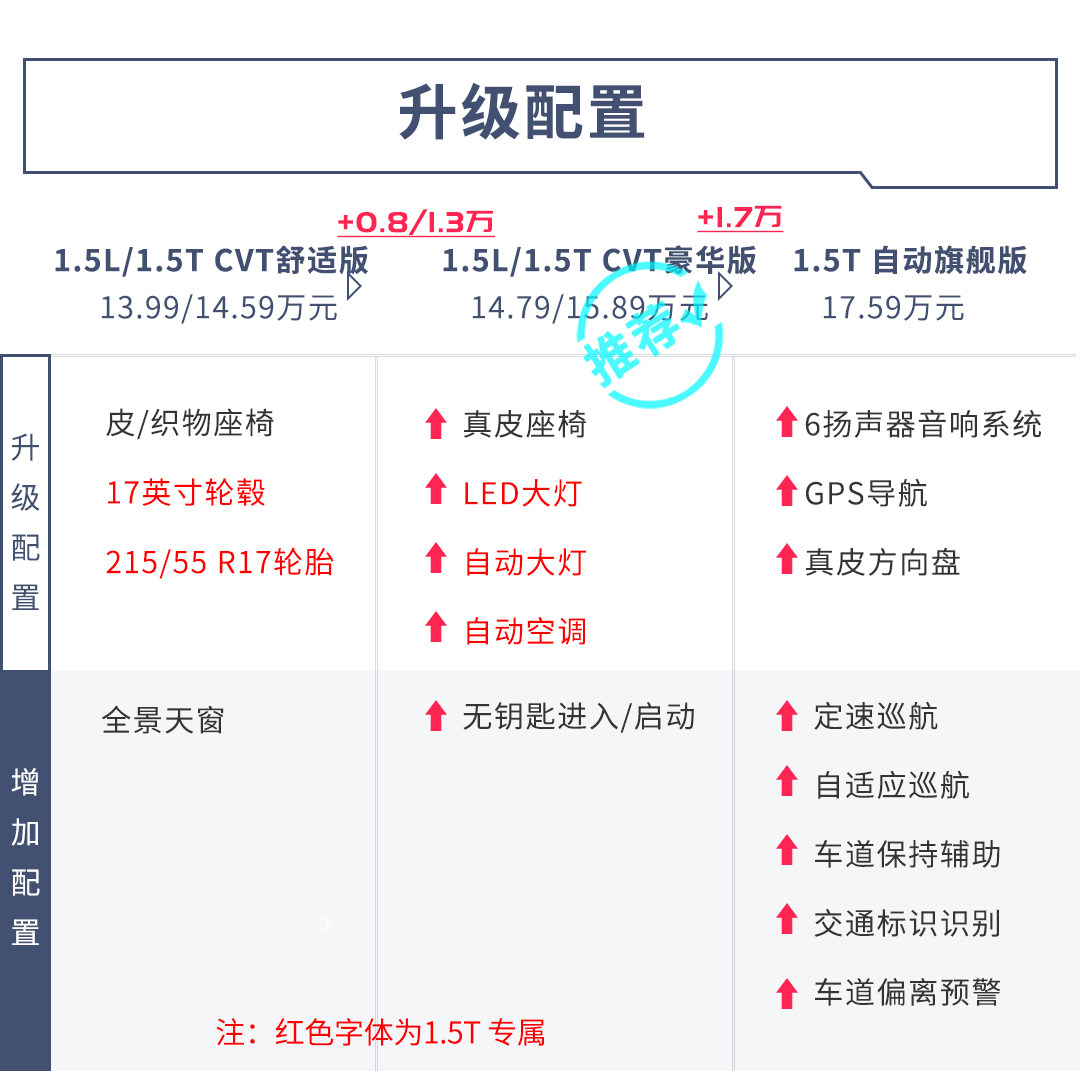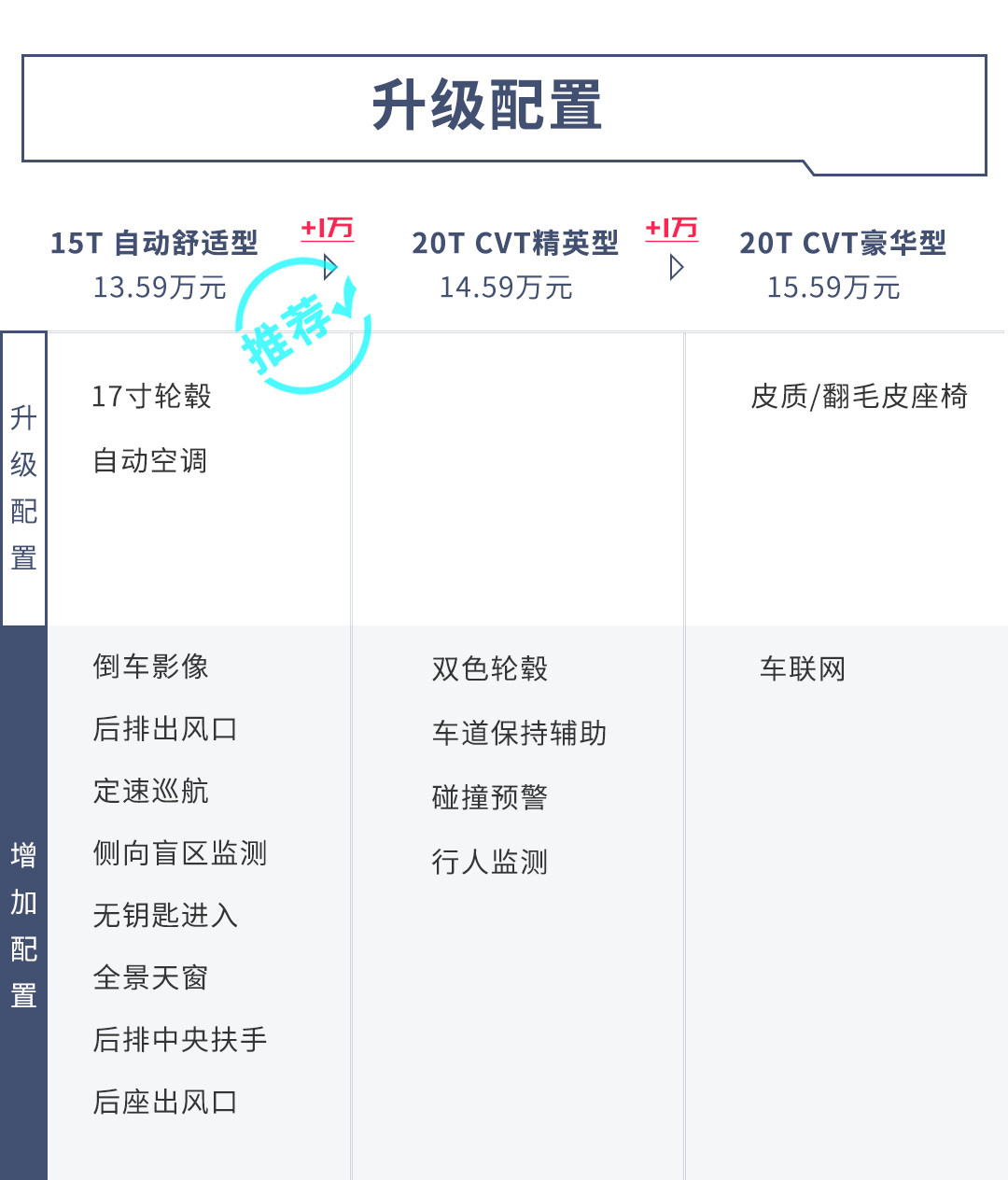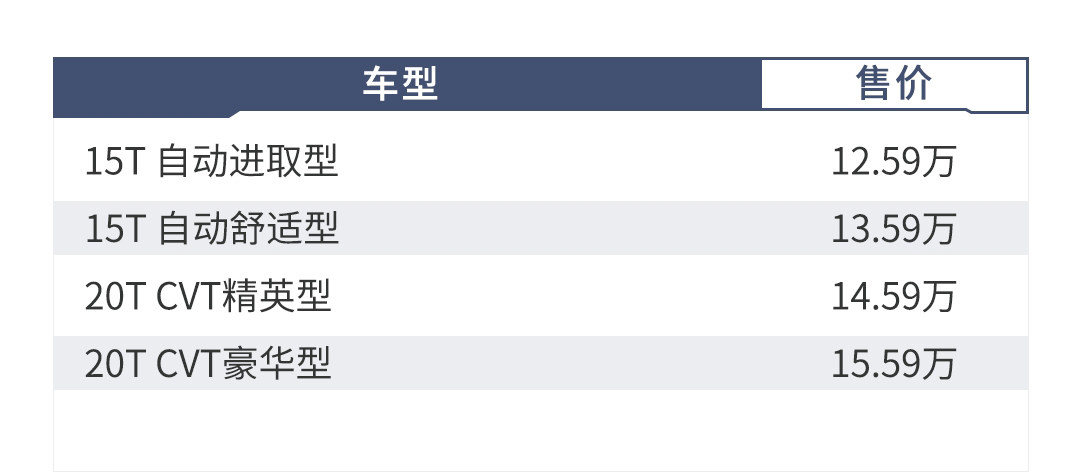 15TCVT舒适型在基础配置上增加了定速巡航、并线辅助、无钥匙进入、全景天窗等。价格更高一级的20T精英型在配置上阉割了并线辅助、后排出风口和后排扶手/杯架等,最低配15TCVT进取型仅为16英寸轮毂、没有倒车影像、全景天窗等种种配置,顶配20TCVT豪华型价格已经高达15.59万,此时可以买到空间更大的昂科拉GX,所以15T CVT舒适型是比较合理的选择。