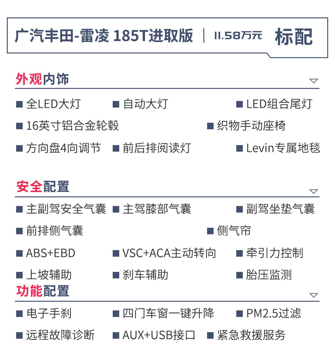 这次丰田雷凌属于换代车型,换代后的雷凌基于TNGA架构打造、驾控方面有了非常大的进步,整车NVH性能也比上一代出色,达到了一流的水准。全车除了低配都普及了L2自动驾驶辅助也算雷凌最大的亮点。