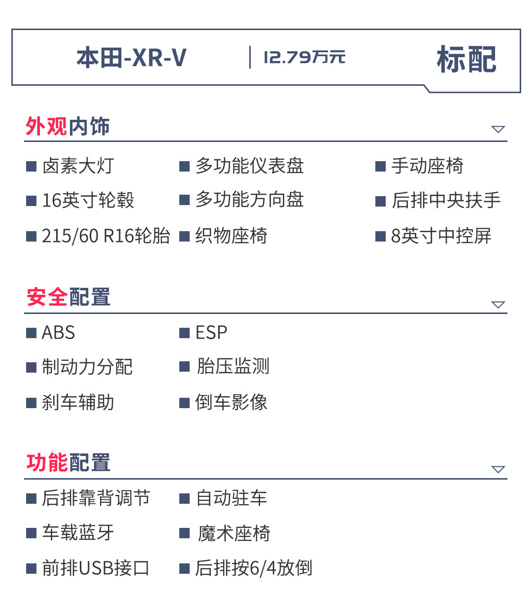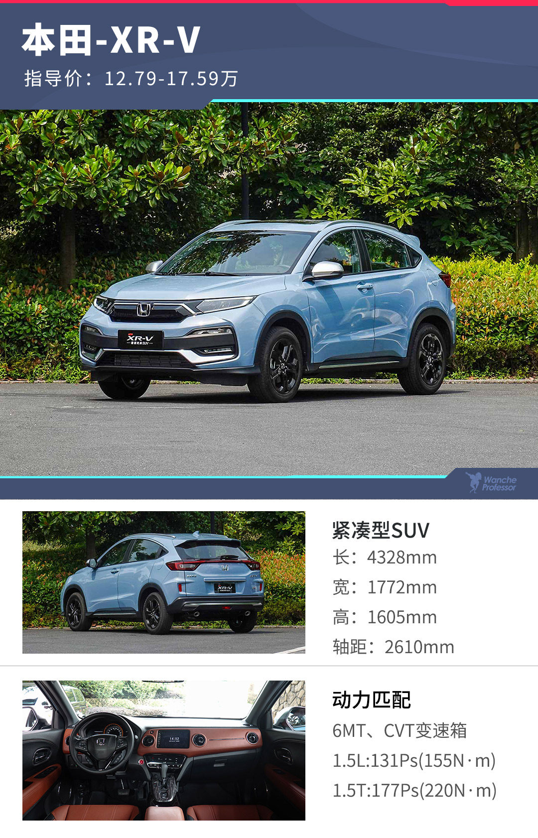 本田XR-V共有四个配置,1.5L+1.5T两套动力配置加起来总共7个版本,价格范围从12.79-17.59万。总的来说,XR-V的配置价格比不算特别划算。当然,大家不是奔着XR-V的配置去买车的。