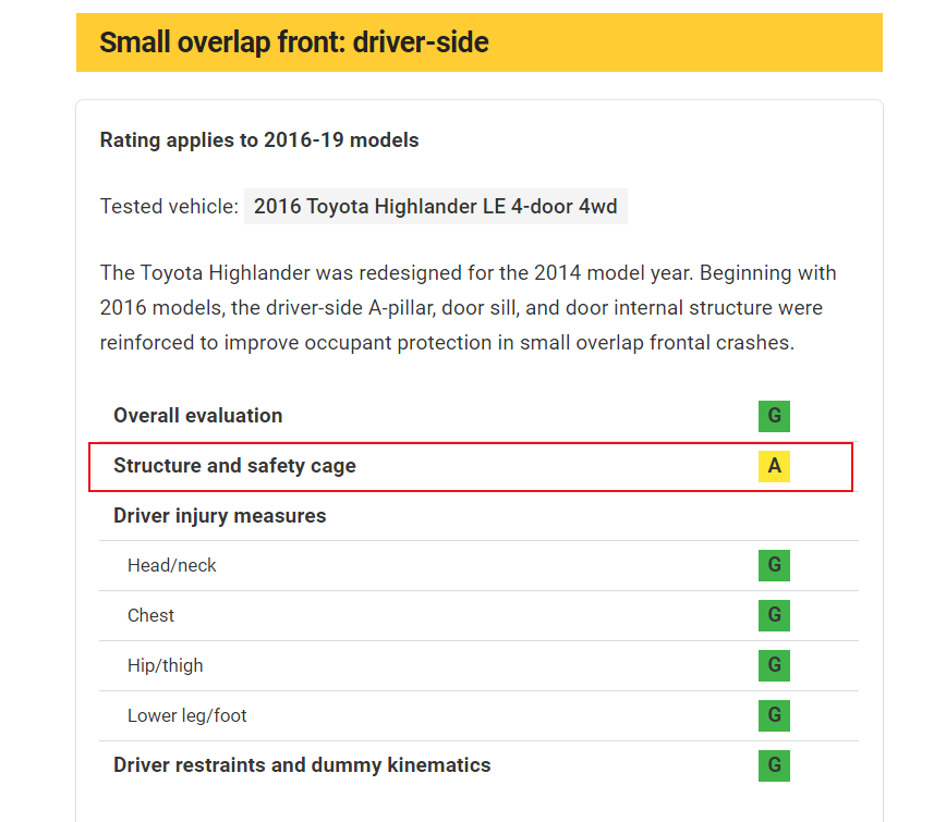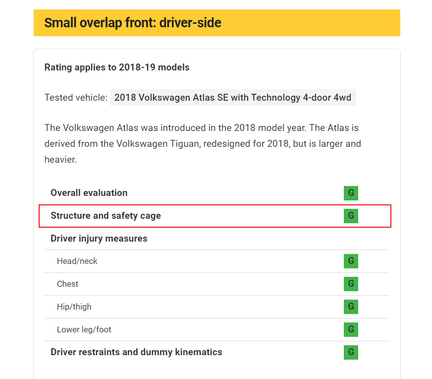 皮实和耐用不能混为一谈,虽然说不容易出毛病也算是皮实,但是在教授看来皮实应该是车身的强度。显然,途昂作为德系车中的旗舰级中大型SUV,全车的钢架强度是高于汉兰达的。我们可以看看国外比较权威的IIHS碰撞测试。