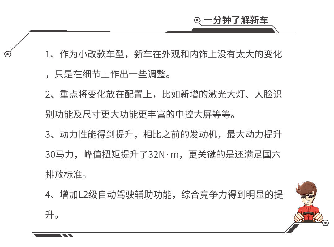 整体的动力总成没变,动力搭配依然是2.0T涡轮增压发动机+7速湿式双离合变速,悬架依然是前麦弗逊后多连杆独立悬架。但发动机和变速箱则有不同程度的优化,对于发动机而言,动力性能得到提升,相比之前的发动机,最大动力提升30马力,峰值扭矩提升了32N·m,更关键的是还满足国六排放标准。而对于变速箱而言,面对新的发动机,也在硬件上进行了优化,以便更好的与发动机形成更默契的动力输出 。