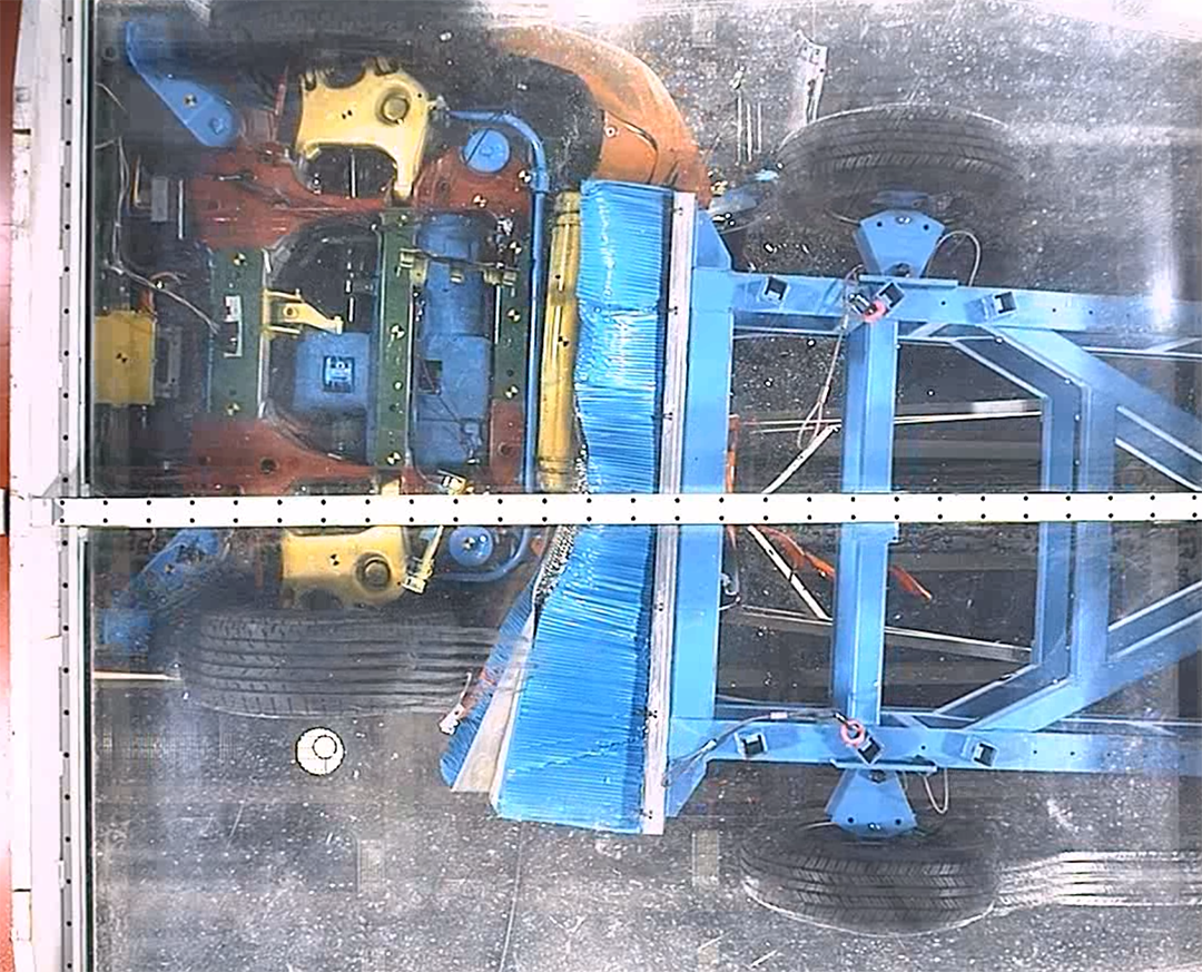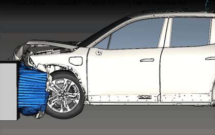 在斜侧75度,以32km/h的时速进行欧标柱碰实验中,横梁的溃缩并未侵入电池舱。